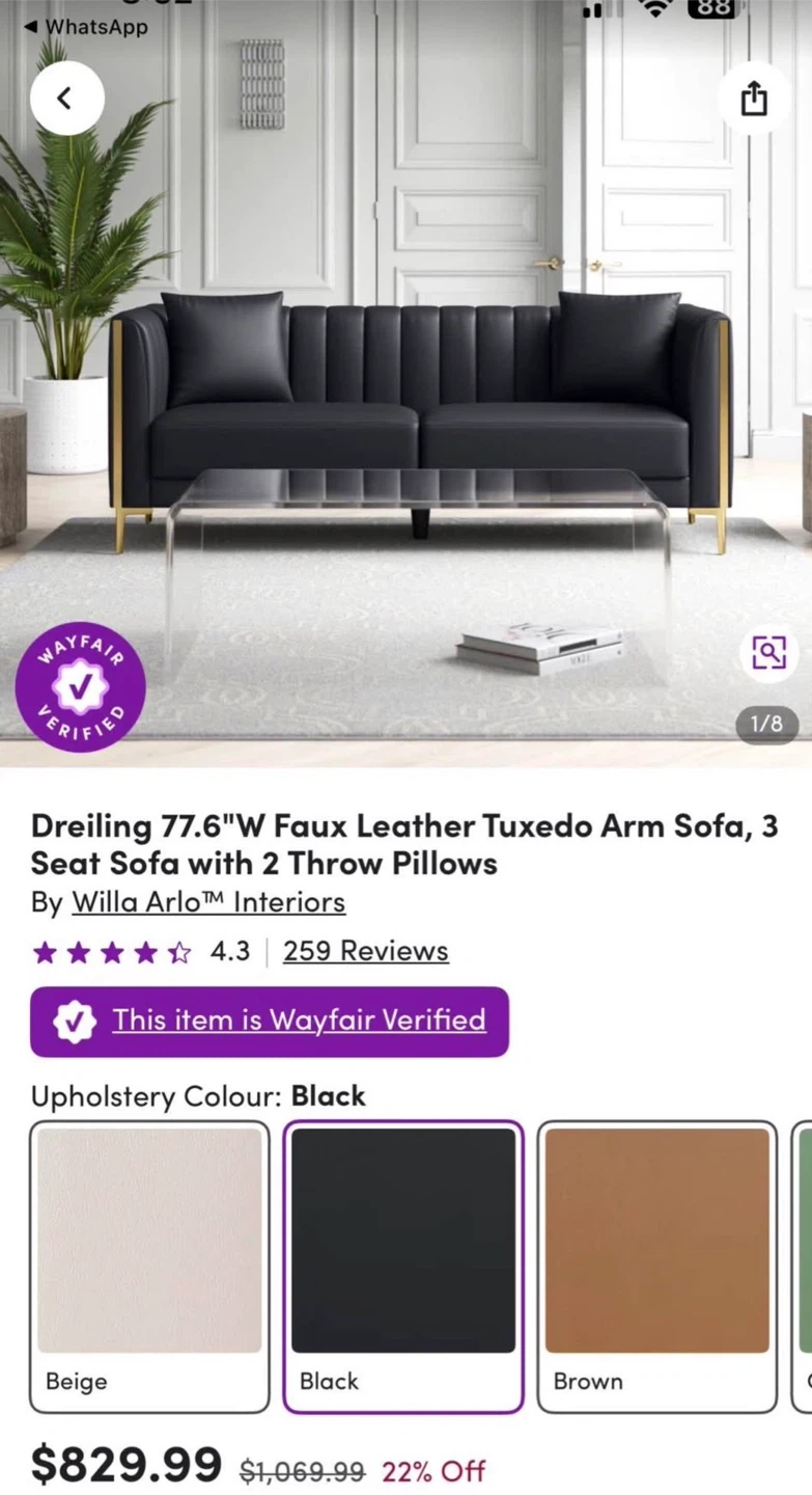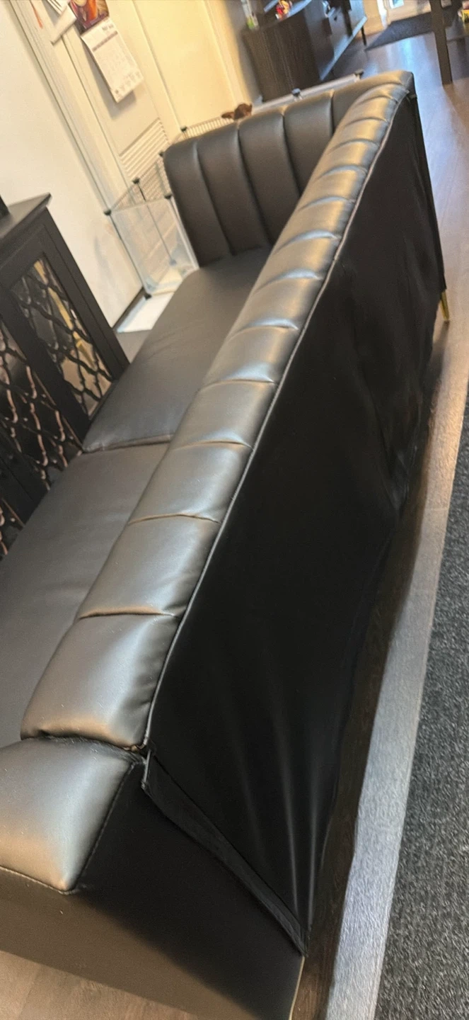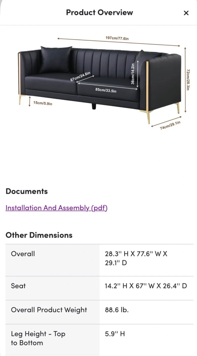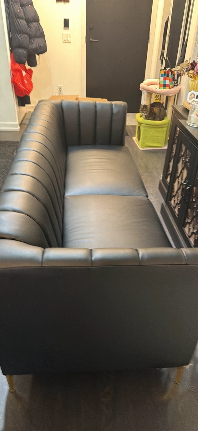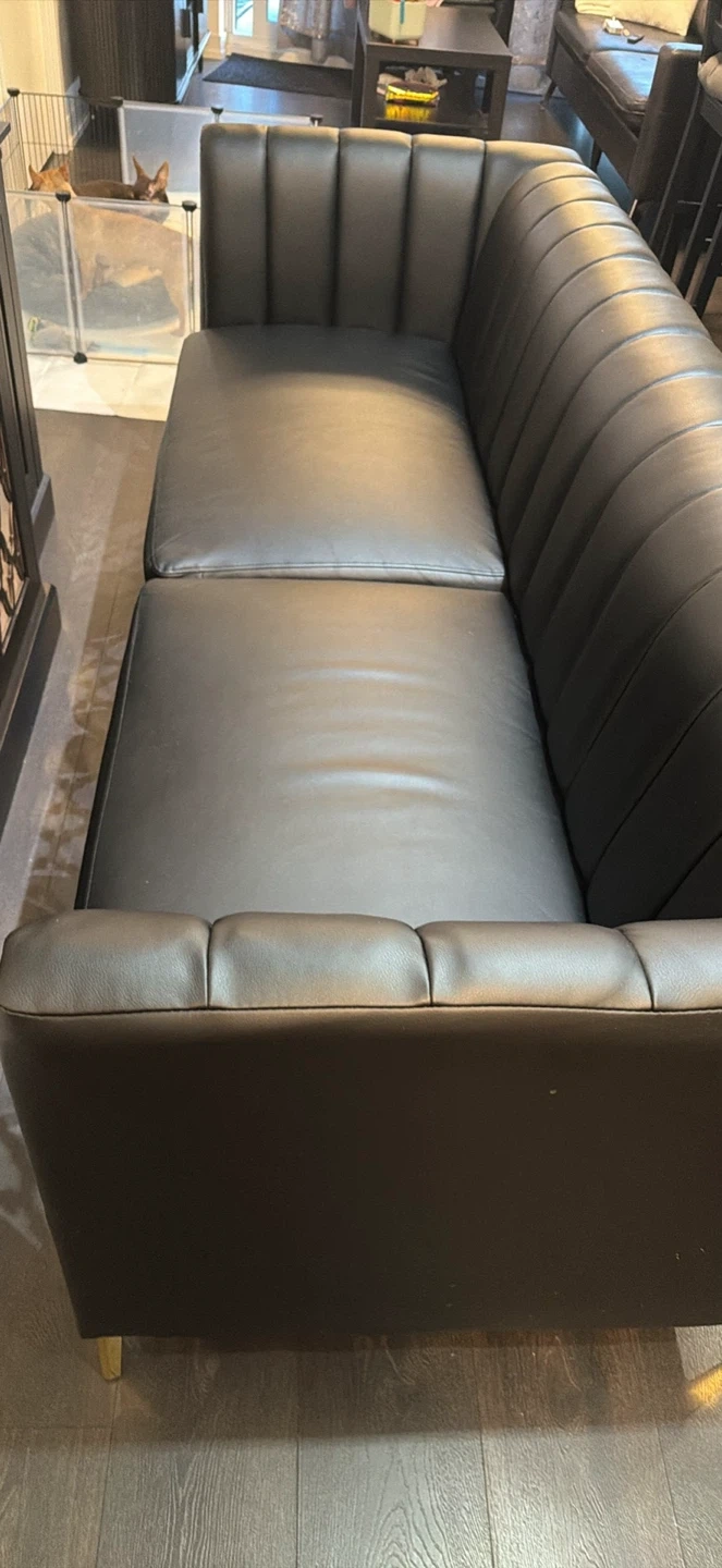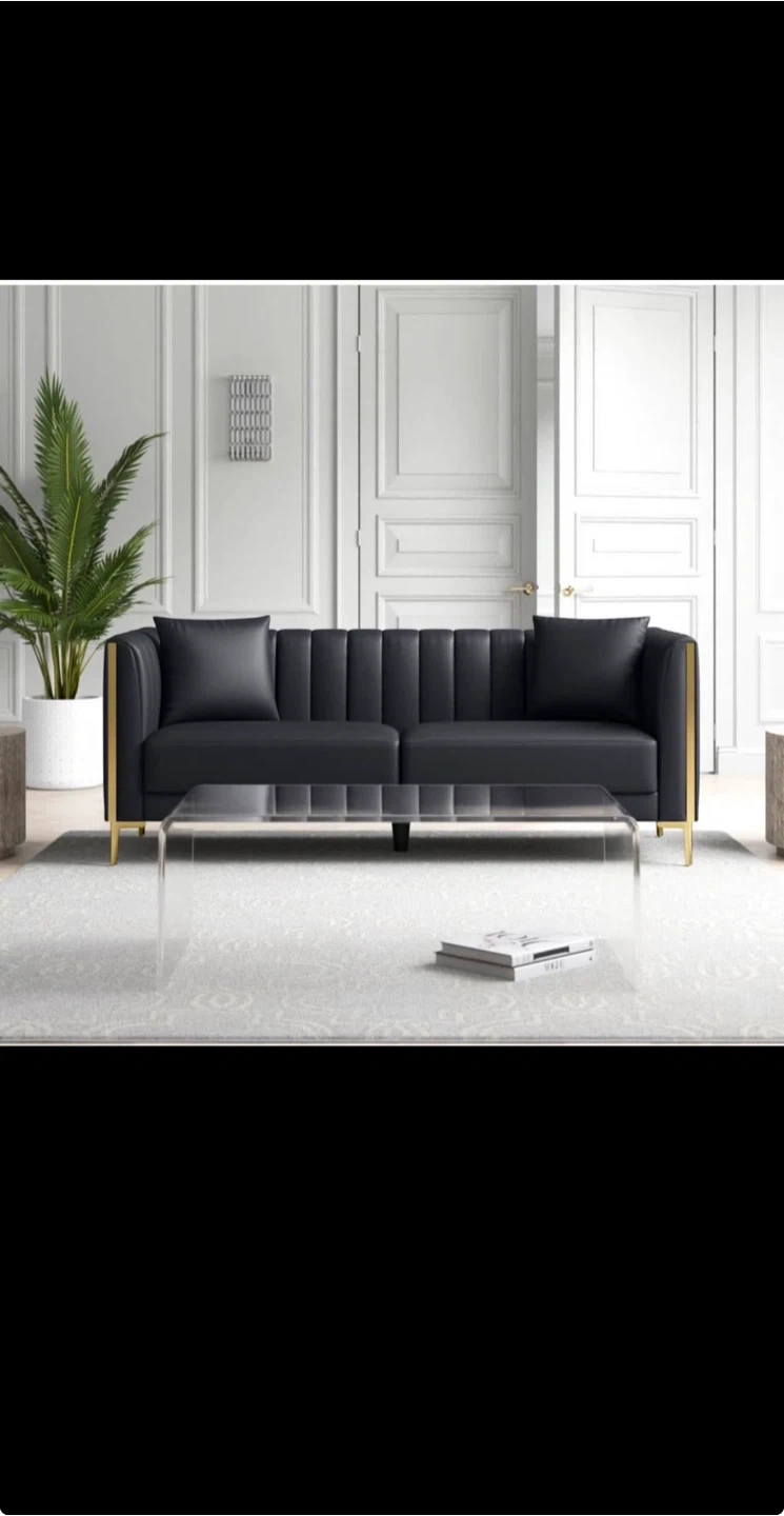Selling a stylish black leather sofa, perfect for adding a touch of modern elegance to your living space. It features a sleek design with eye-catching gold accents. The sofa is in great condition and ready to find a new home!