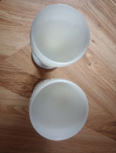 This set of 2 Anchor Hocking footed goblets is made of white milk glass, produced in the 1960s with a vintage design. The goblets are versatile for all occasions and feature an American fruit theme, making them a unique addition to any kitchen collection. With their elegant design and historical significance, these goblets are a must-have for collectors of vintage glassware.