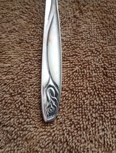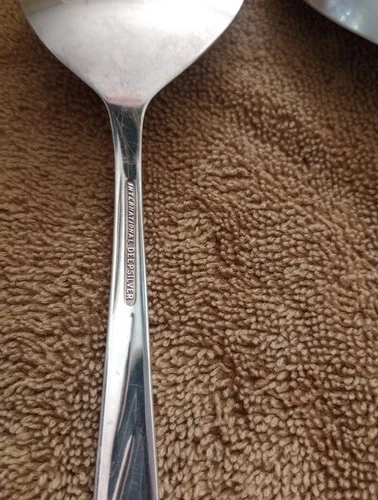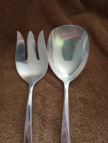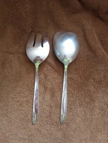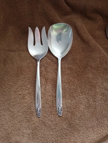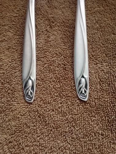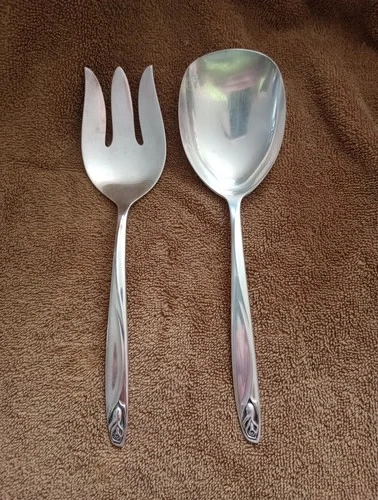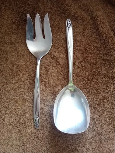 Vintage 1962 International Deep Silver 9" serving spoon and fork set featuring the Anniversary Rose pattern. Made of silverplate, these serving pieces are a classic addition to any table setting. The brand, International, is known for producing high-quality silverware, and this post-1940 set is a timeless and elegant choice for special occasions or everyday use.