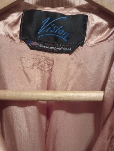 The Vintage 1980's Satin Trenchcoat by Vision is a stylish and unique addition to any wardrobe. Featuring a copper snakeskin embossed design, this coat exudes a classic elegance with a modern twist. Made from luxurious satiny material, this coat from the 1980s offers a timeless style that can be dressed up or down for any occasion. Perfect for those looking to make a statement with their outerwear, this trenchcoat is sure to turn heads and elevate any outfit.