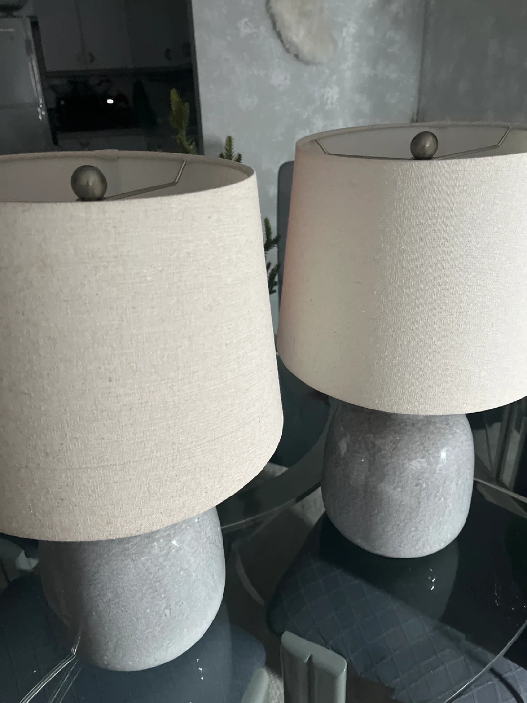 Selling a set of two table lamps! They feature a gray base with a speckled design and neutral-colored shades. These lamps are perfect for adding a soft glow to any room. They are in great condition and ready to brighten up your space