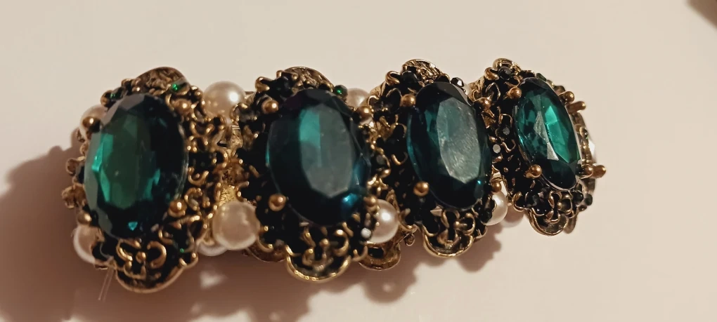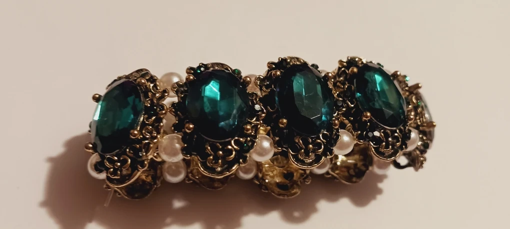 This bracelet features beautiful emerald green glass cabochons surrounded by small pearls. It has a vintage inspired look with gold accents. A lovely accessory to add a touch of elegance to your style!!! Excellent condition. ALL MY PRICES ARE NEGOTIABLE !!!