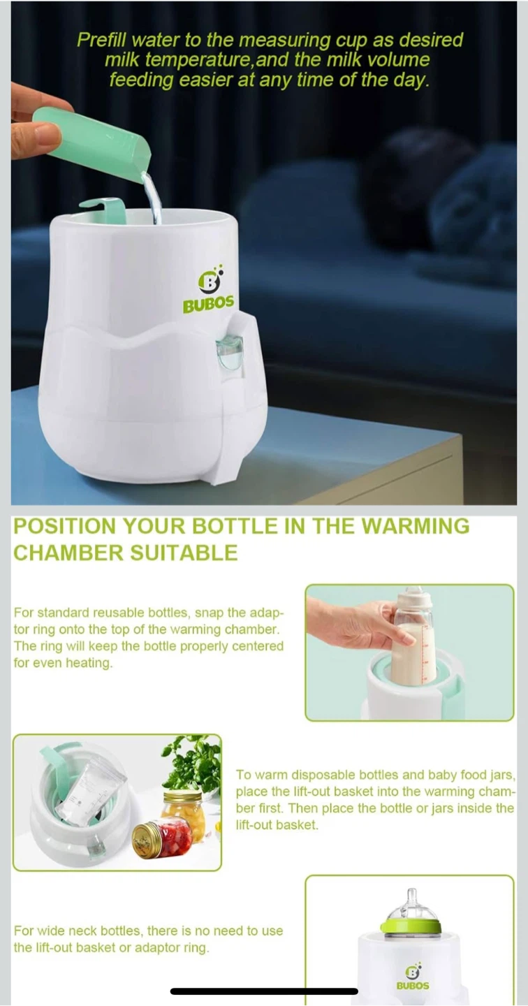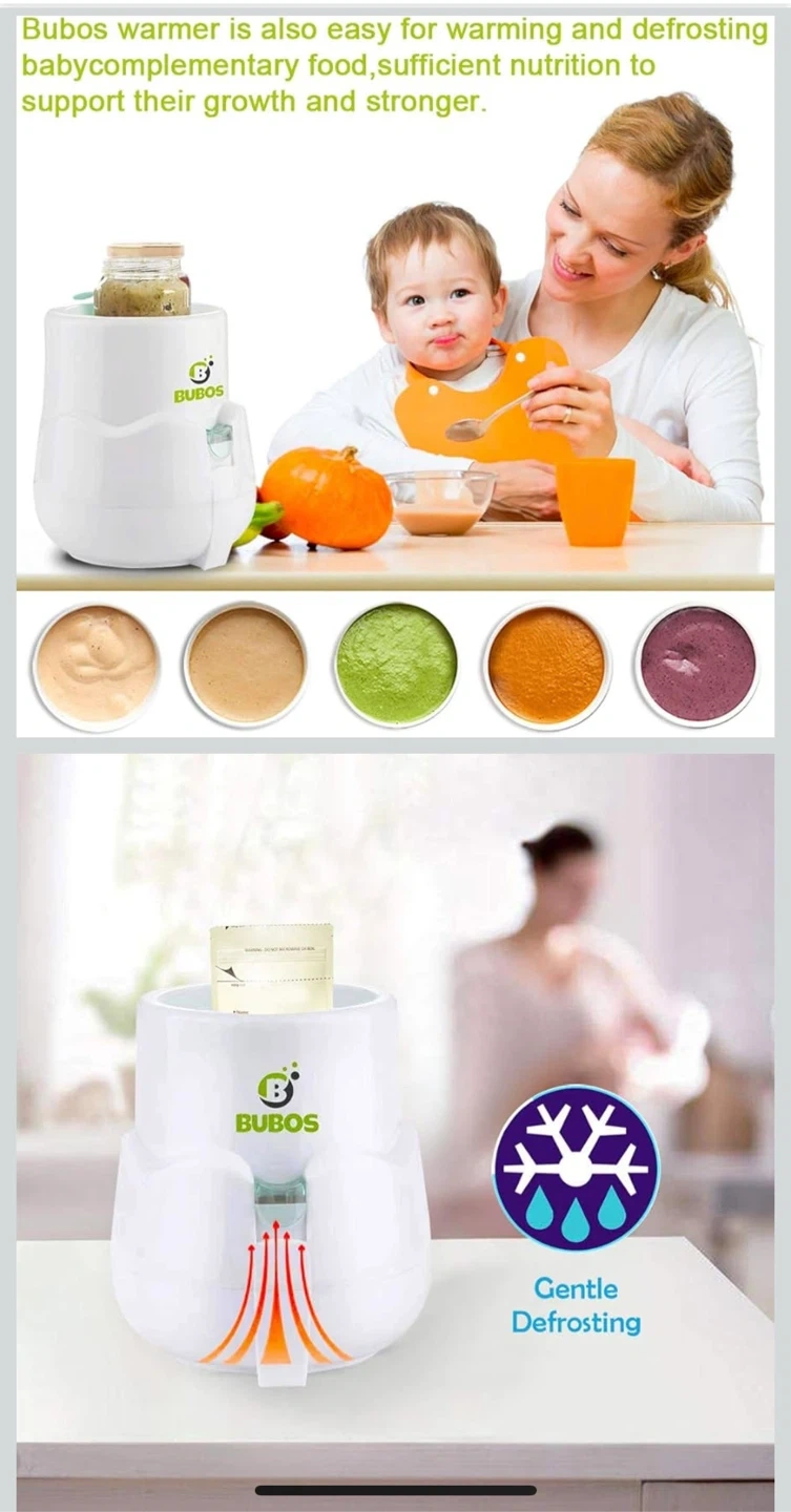 Selling a BUBOS baby bottle warmer! It's in excellent condition and ready to use. It's designed for warming and defrosting baby food and bottles, making it super convenient. It's easy to use with just one button, and it even has an auto-shut off feature. It's suitable for standard reusable bottles, wide neck bottles, disposable bottles, and even baby food jars!