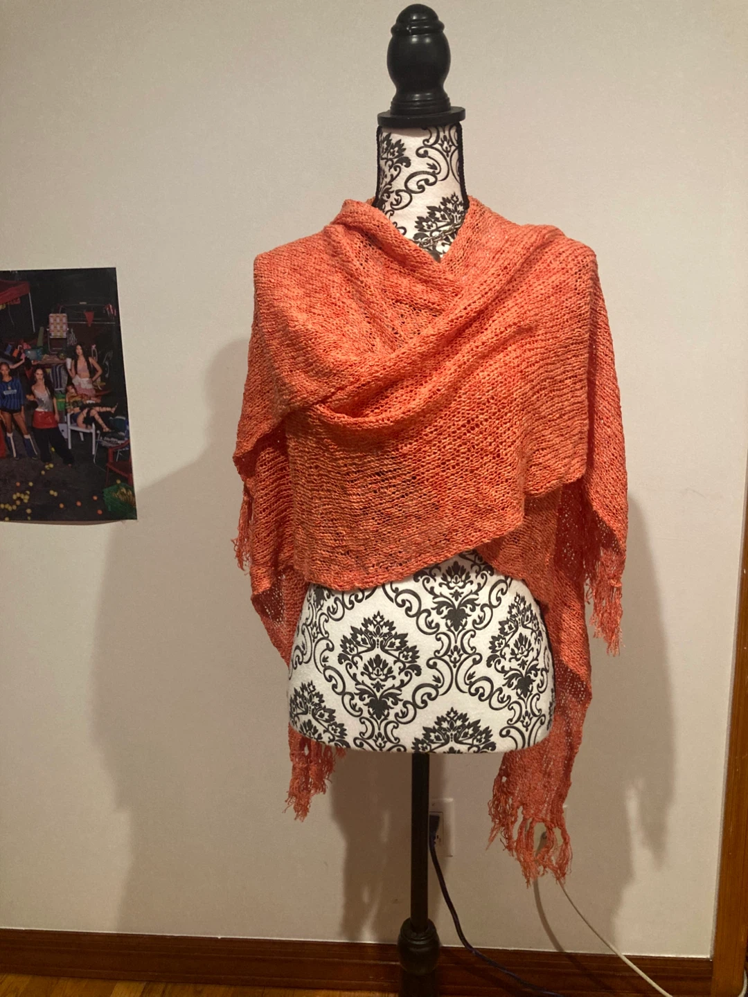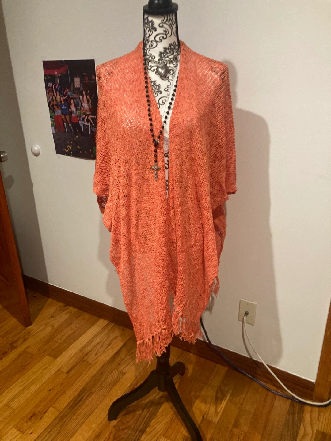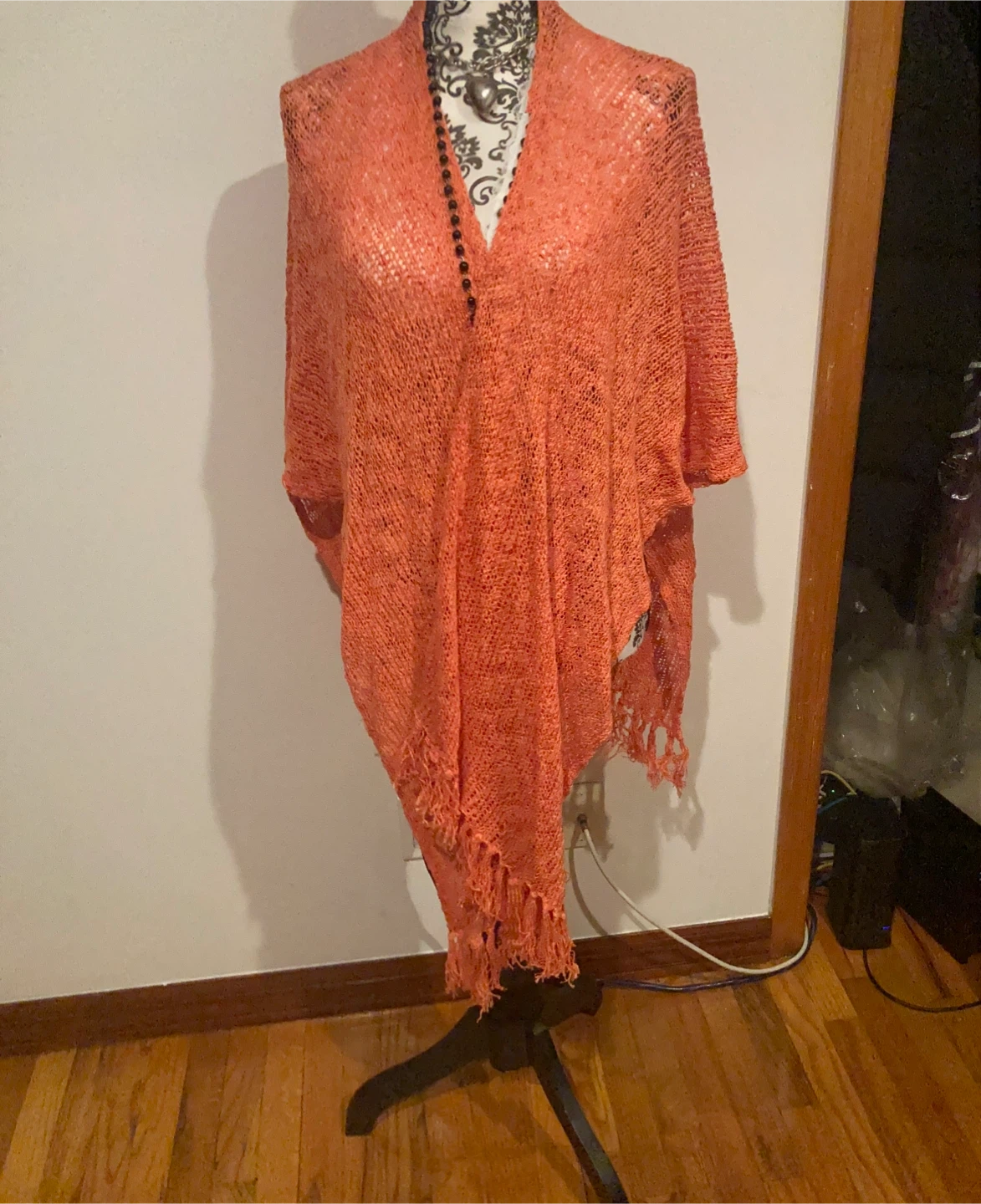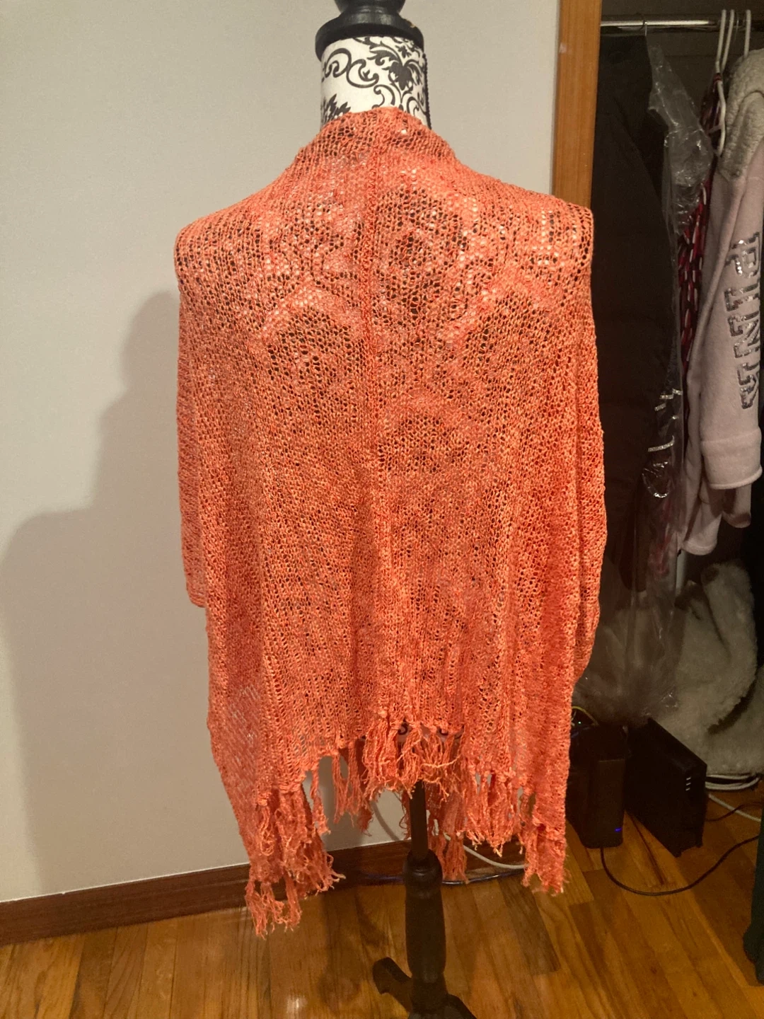 Selling a coral knit shawl with fringe! It's a beautiful piece that can be styled in many ways. The open knit gives it a light and airy feel, perfect for layering. It's in great condition and ready for a new home!