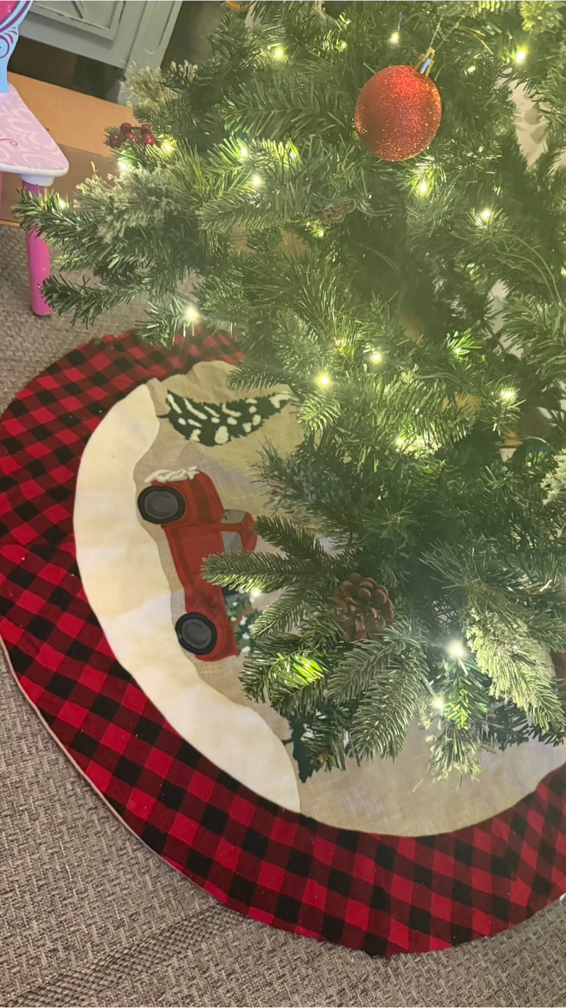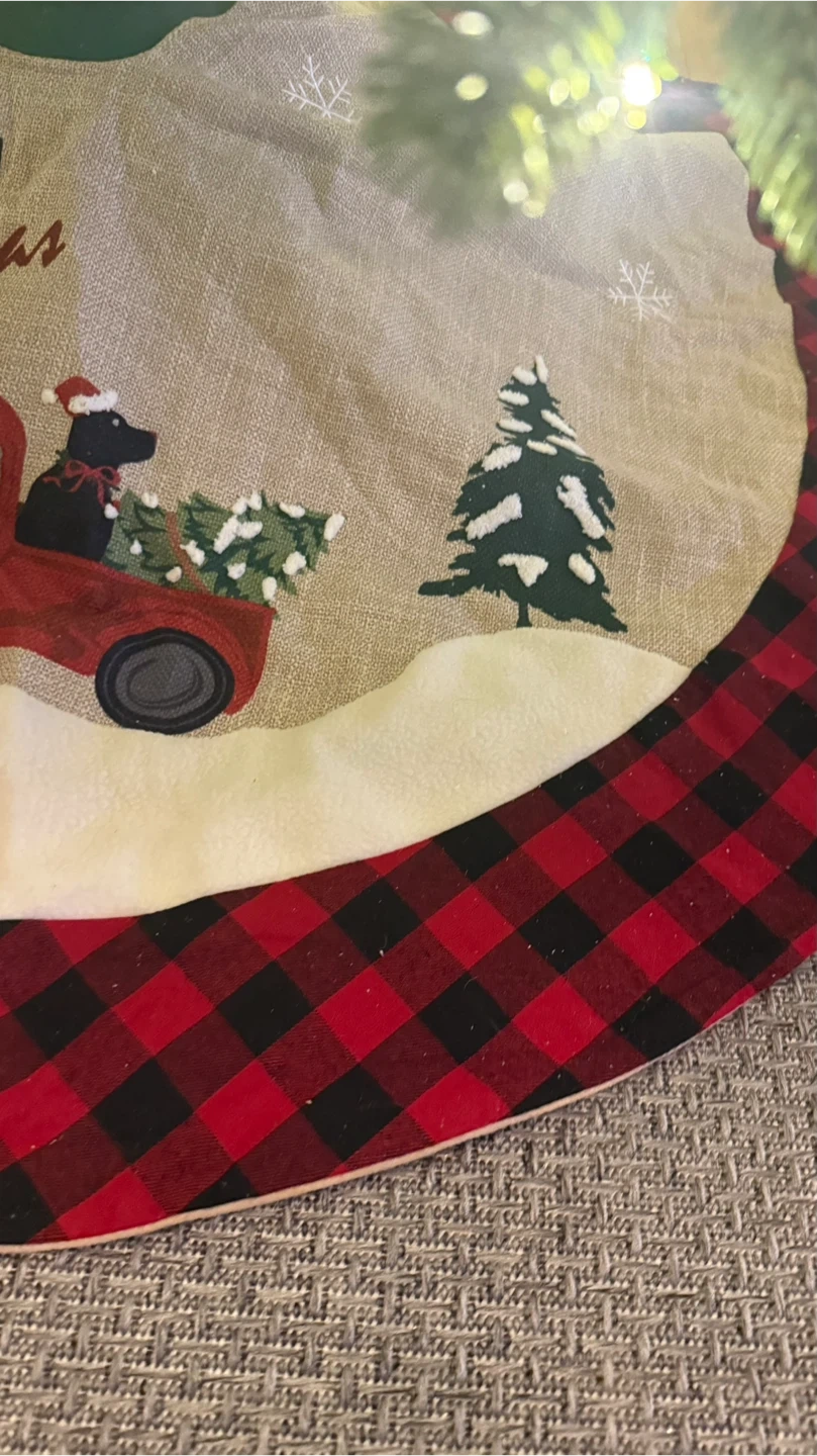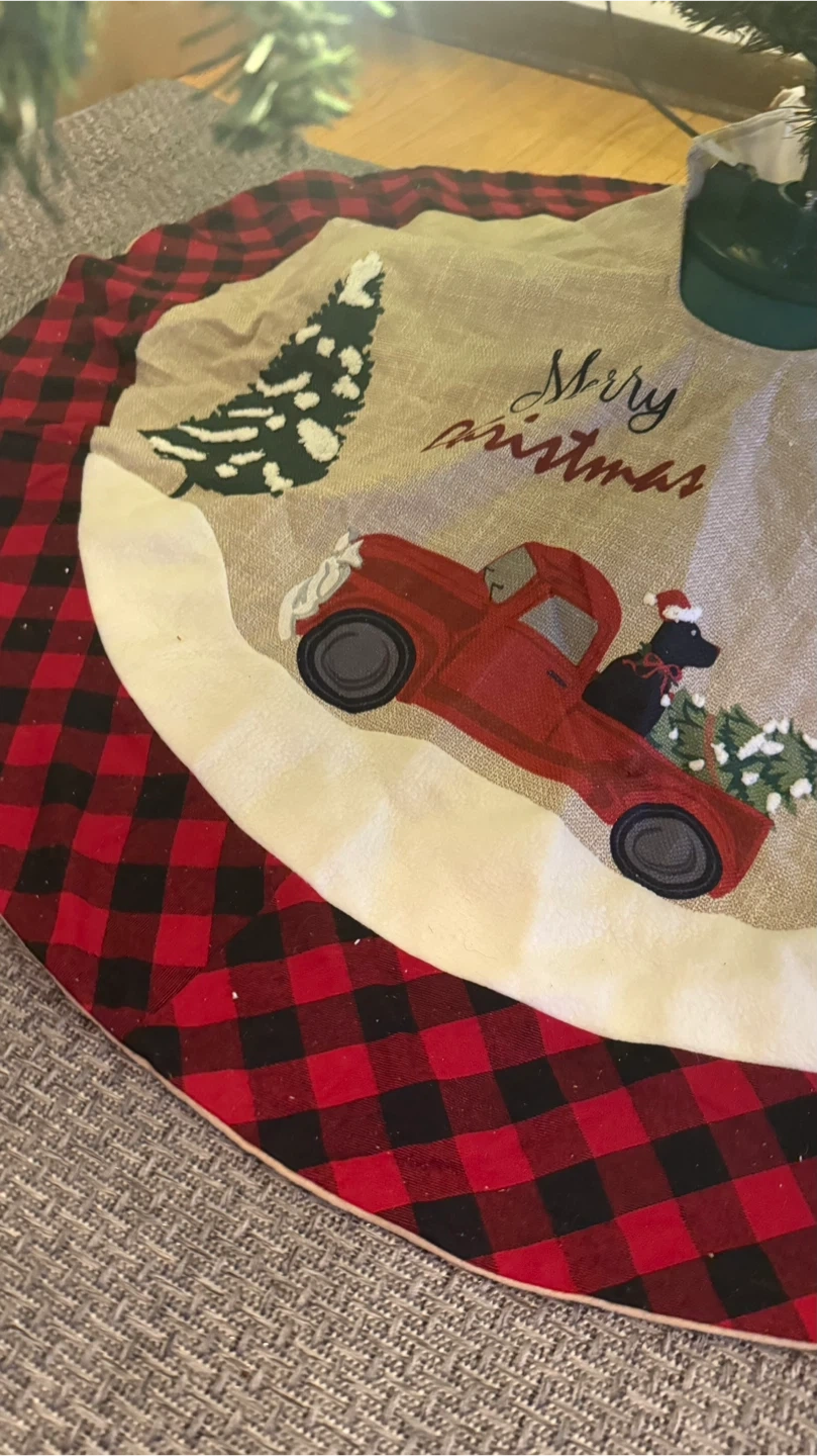 Get ready for the holidays with this festive Christmas tree skirt! It features a charming design with a red truck carrying a Christmas tree and a cute dog wearing a Santa hat. The skirt is trimmed with a classic red and black plaid pattern, adding a cozy touch to your Christmas decor
