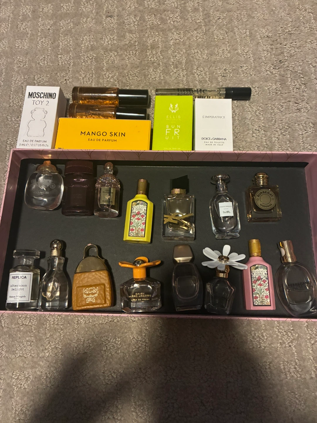 $15 each 4ml to 7.5ml mixture of sprays and dabbers ! You'll find mini perfumes from Moschino Toy 2, Marc Jacobs Daisy Ever So Fresh, MCM, Dolce & Gabbana L'Imperatrice, Ellis Sun Fruit, Maison Margiela Replica Afternoon Delight, Mango Skin, and Burberry Goddess, plus others shown in the tray