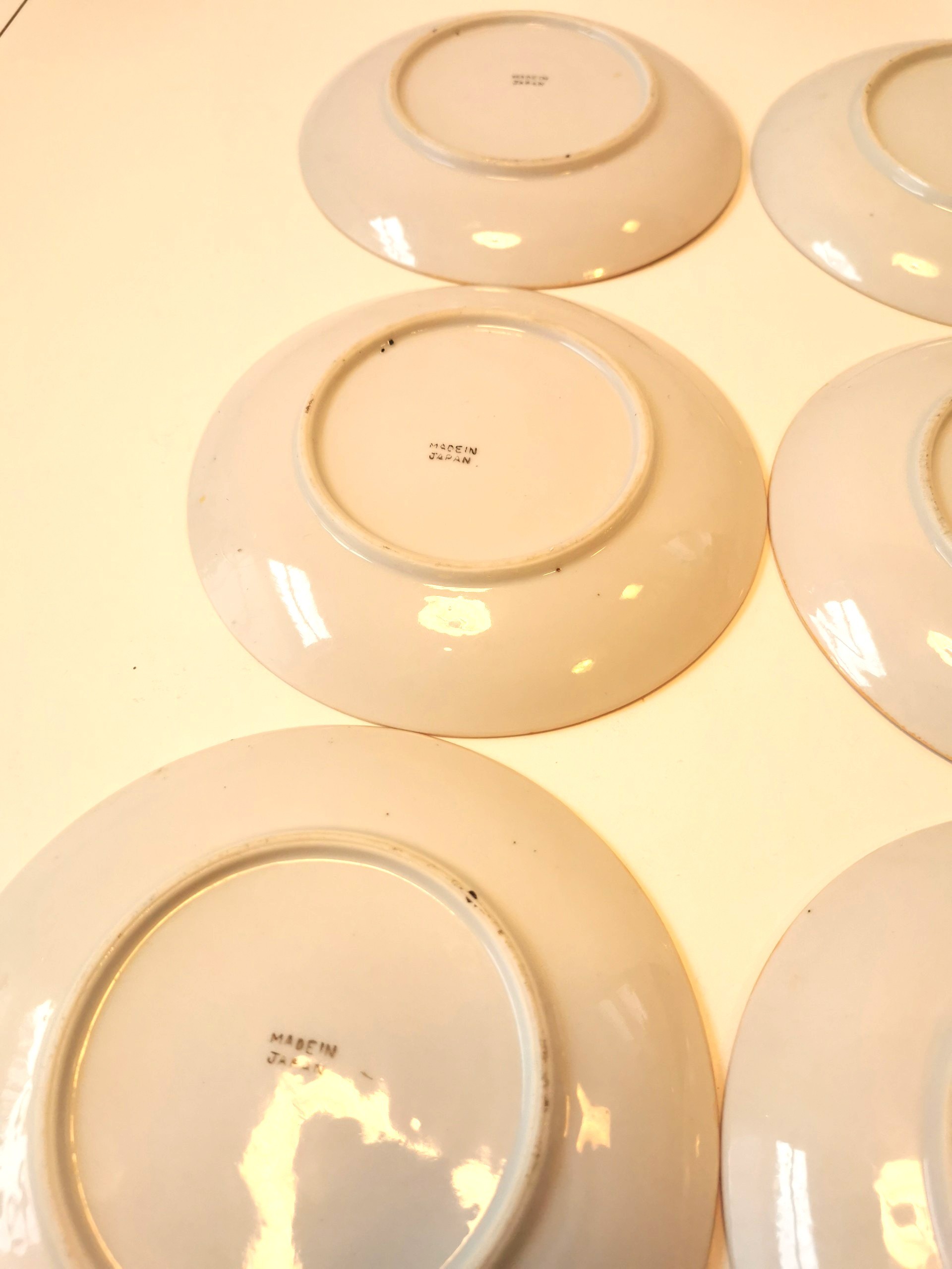 A charming set of six (6) small, collectible porcelain plates from the mid-20th century (c. 1950s-1960s). These plates were mass-produced in Japan for the export market, featuring the popular European/Dutch-inspired windmill motif.