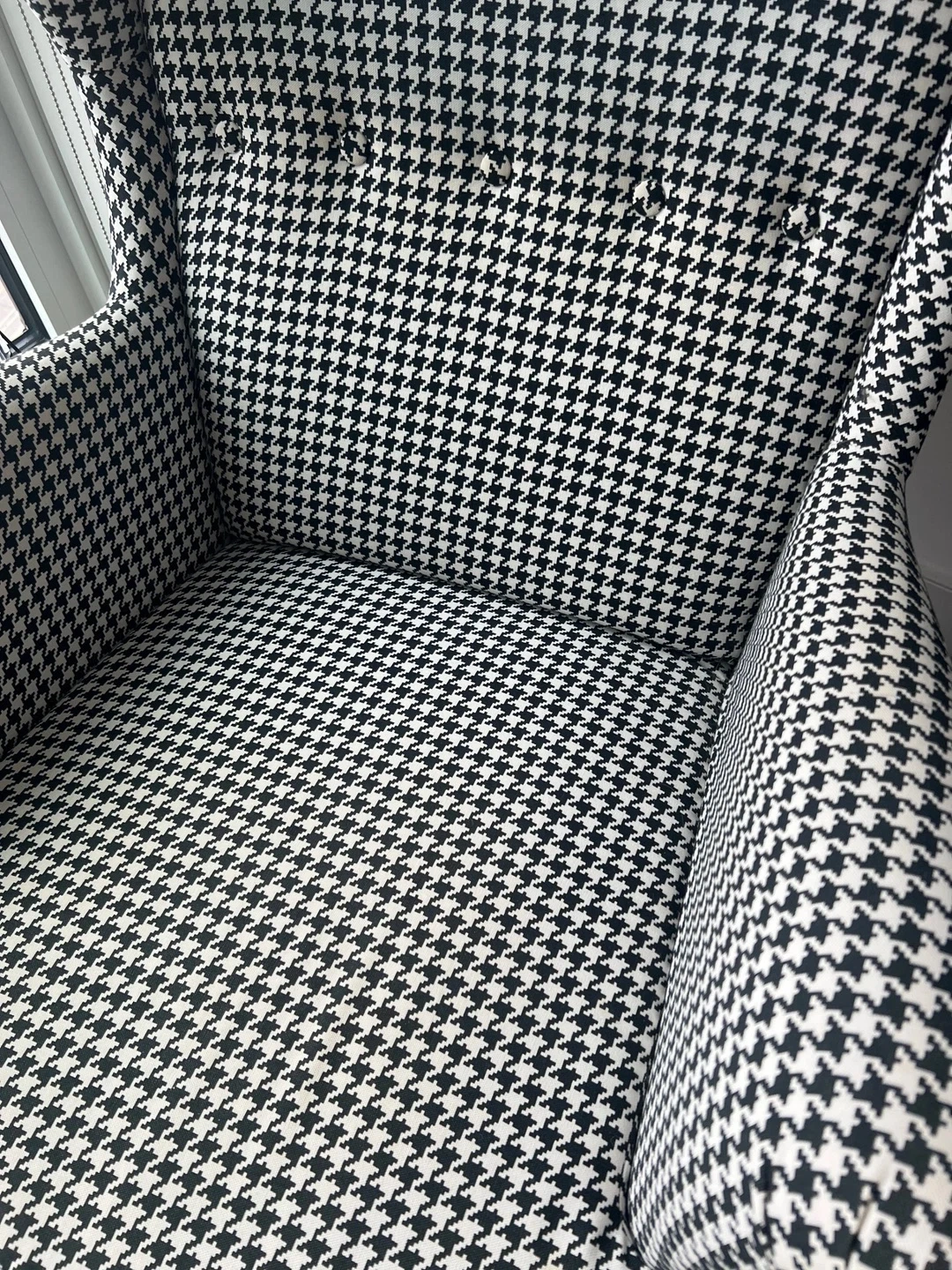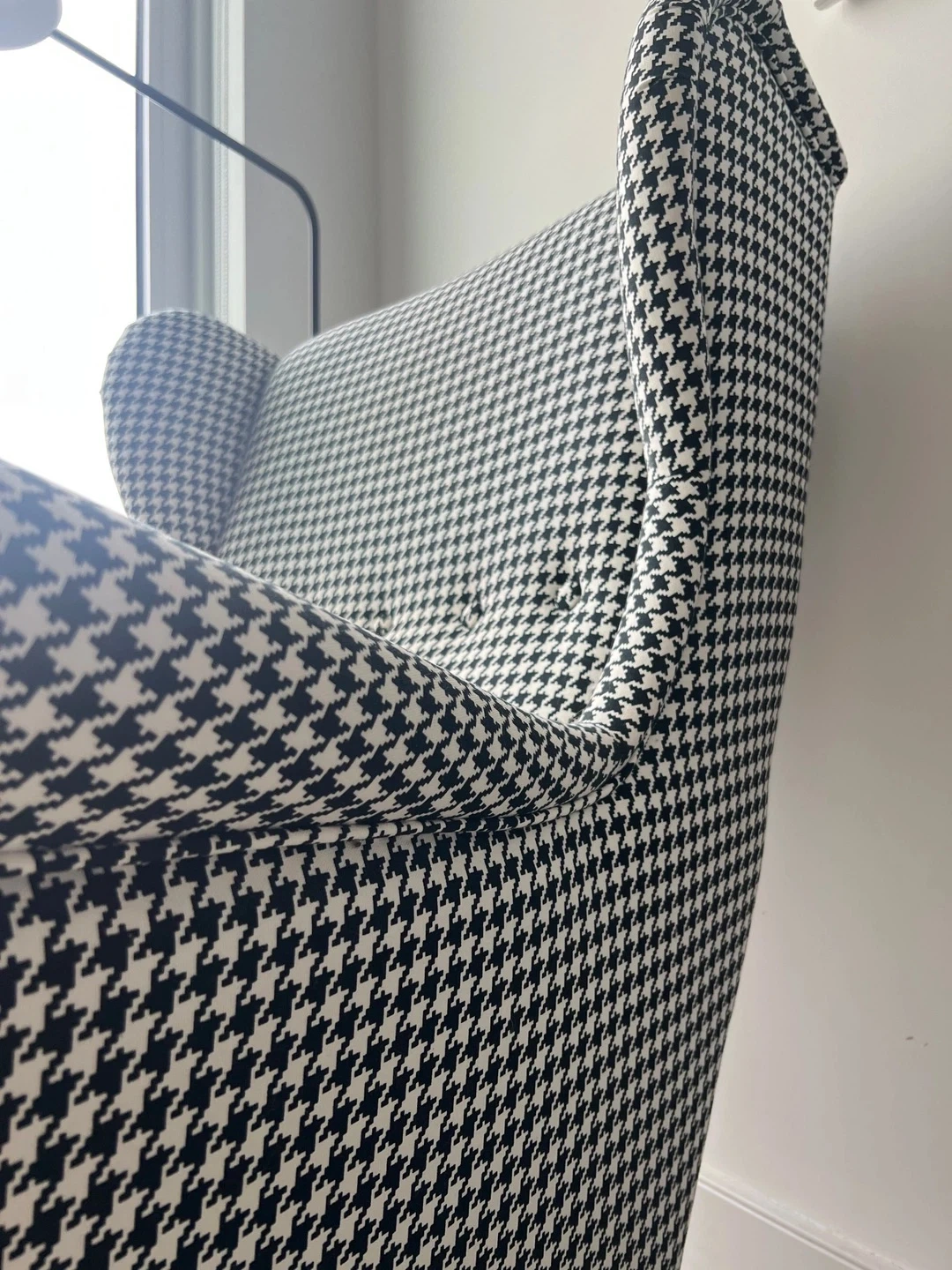Selling an Ikea Strandmon wing chair in a classic houndstooth pattern. It's super comfy and adds a stylish touch to any room! The chair is in great condition and ready for a new home.