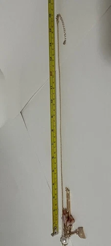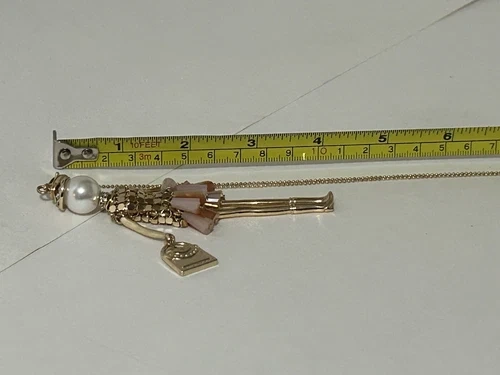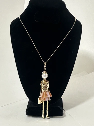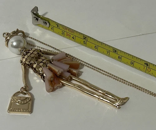 This pre-owned C&C of California necklace features an articulated fancy woman figural charm, all dressed up and ready for any occasion. She is 4 inches long, carries a purse and is very sweet with pearl face and rhinestone highlites. The pendant hangs from a 36-inch gold lobster closure chain. This stylish necklace is stackable and adjustable, making it a versatile addition to any jewelry collection.