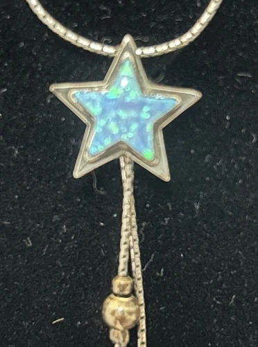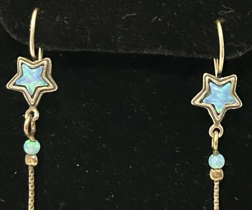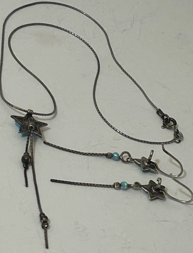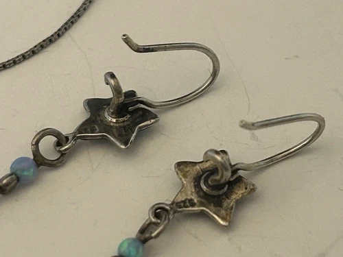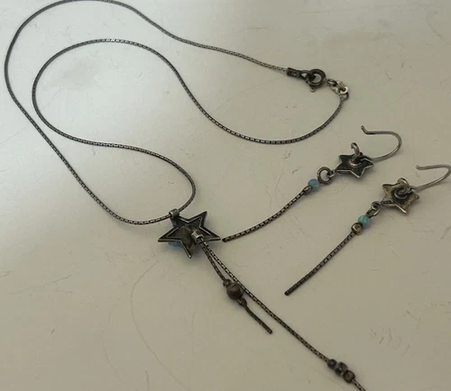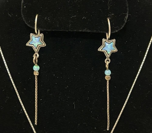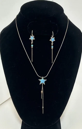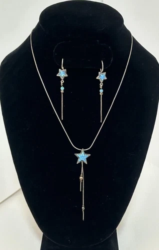 PRICE REDUCED! Get your hands on this sweet celestial inspired jewelry set which includes a beautiful sterling silver necklace & matching earrings adorned with star-shaped blue opal glass stones. In excellent pre-owned condition it is perfect for those looking for a mystic addition to their jewelry collection. Crafted with 925 sterling silver, it is both high quality and durable. This set is perfect for those who love to express their individuality through their accessories.