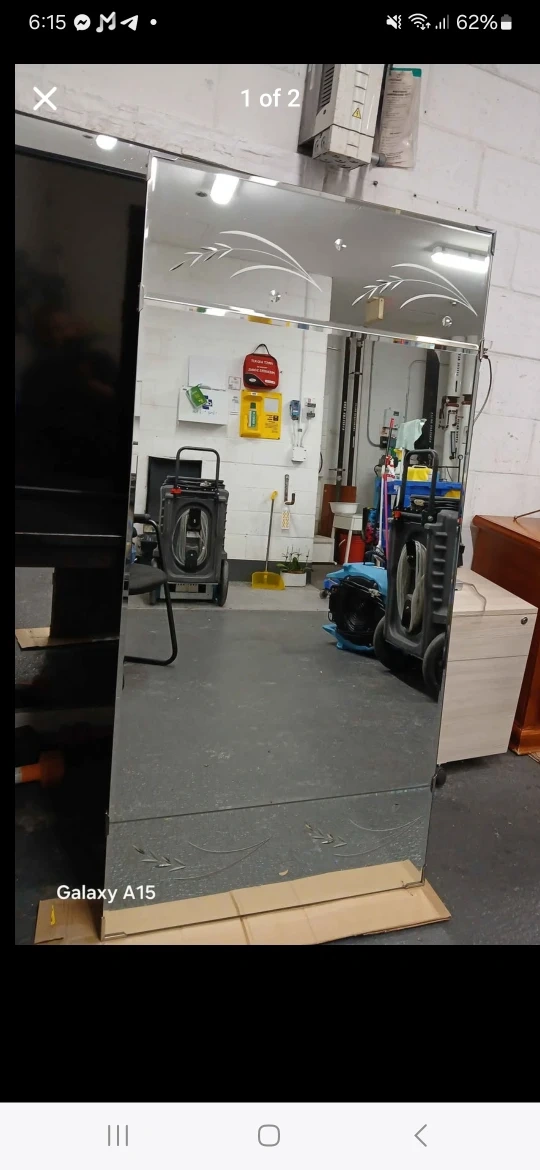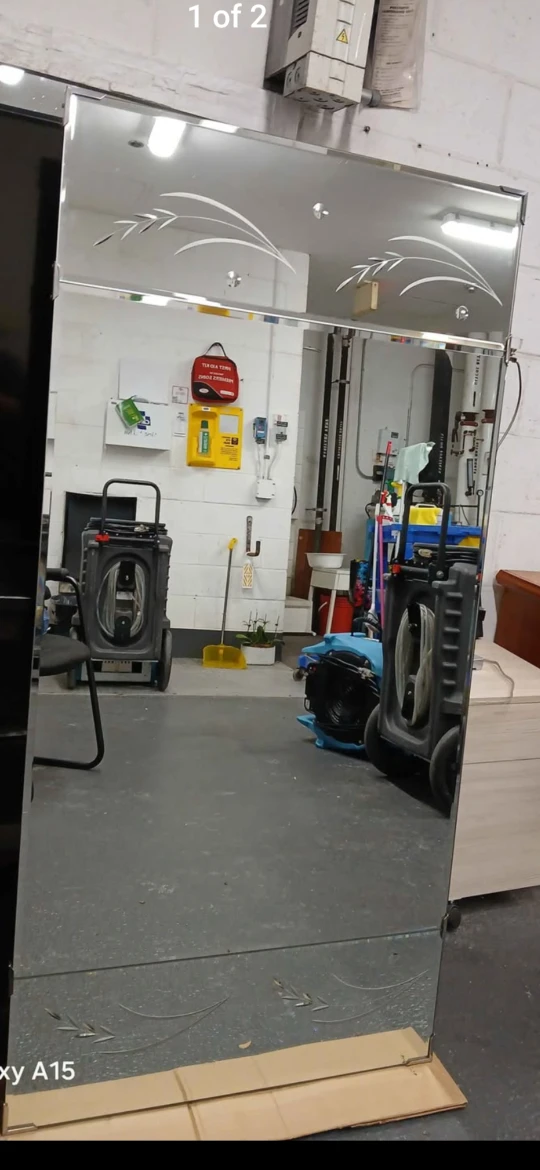 Selling a large decorative wall mirror. It has a simple, elegant design etched into the top. It's in good condition and ready to brighten up any room!
