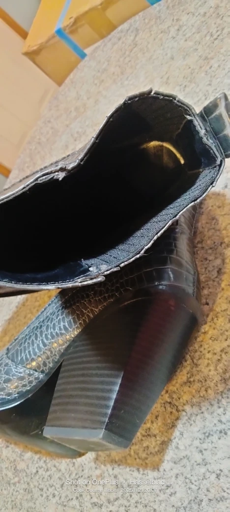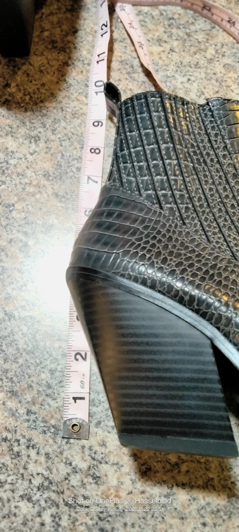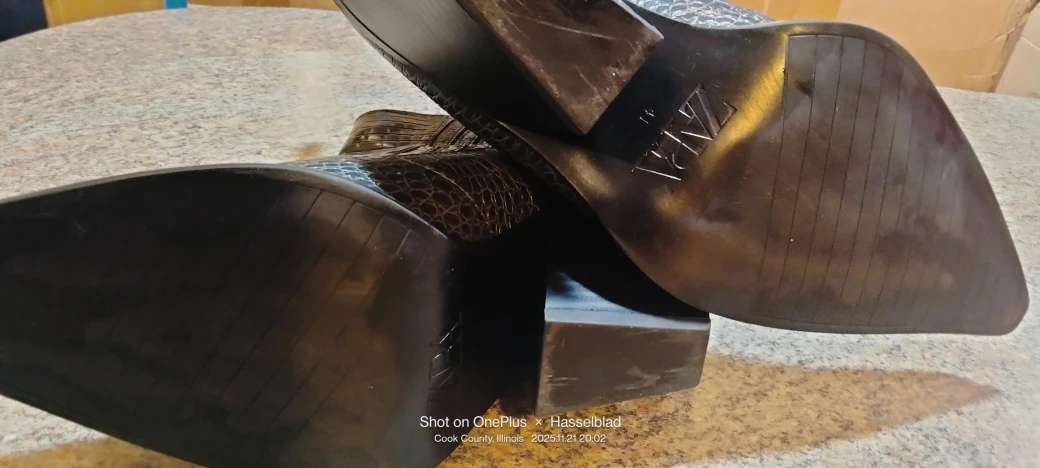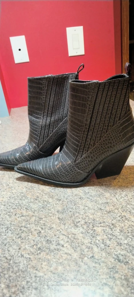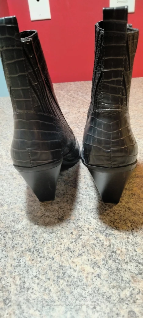 Selling a pair of Zara ankle boots in black with a faux crocodile texture. They have a stylish, pointed toe and a unique, angled heel. These boots are perfect for adding a bit of edge to any outfit!