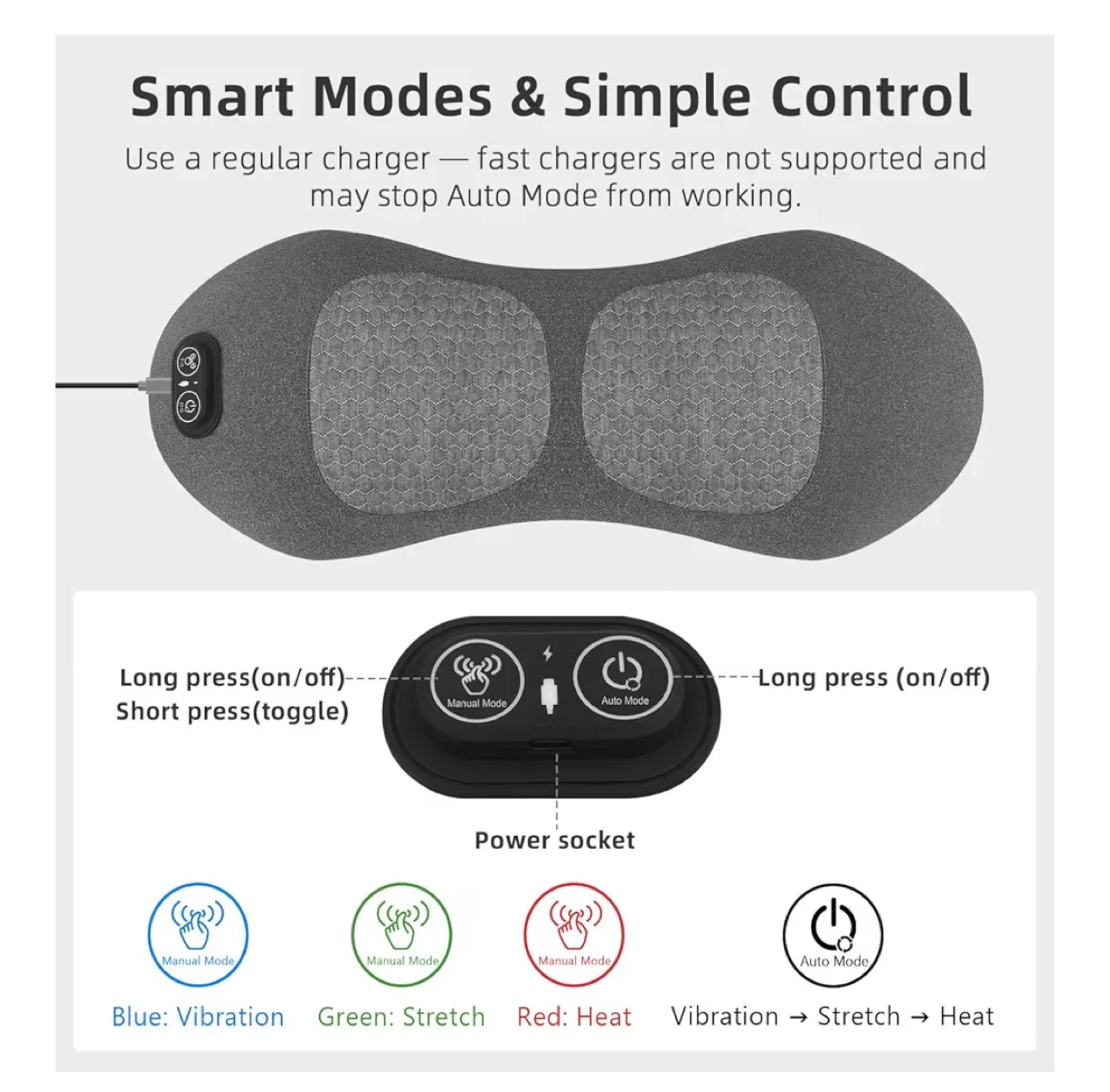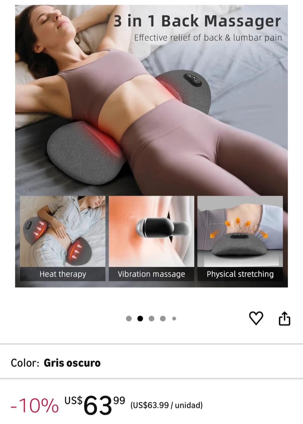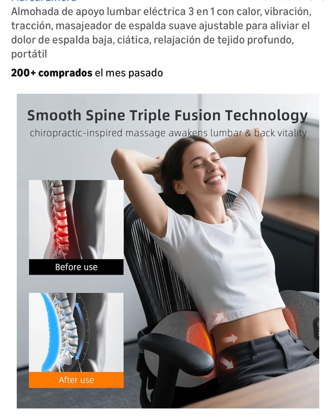 This is a 3 in 1 electric lumbar support pillow with heat, vibration, and traction. It has smooth spine triple fusion technology and is chiropractic-inspired. It massages and awakens lumbar and back vitality. It also has intelligent air lift and stretch for physical spinal traction and ultimate lumbar relief.