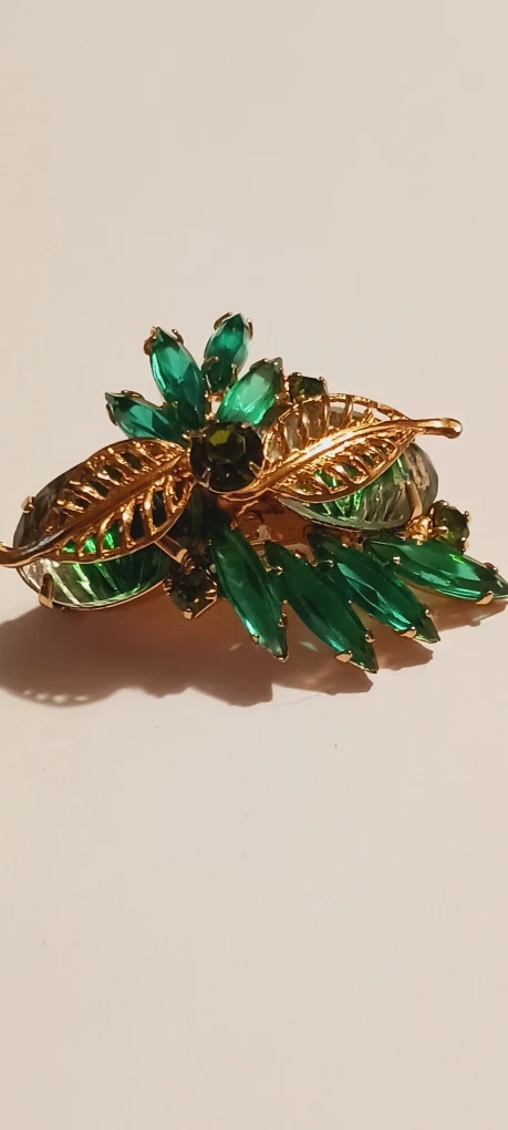 Absolutely Gorgeous Vintage 1950s JULIANA D&E DELIZZA ELSTER Green Givre Art Glass Emerald Navettes Cabochons Gold Tone Brooch.Beautiful green and gold floral brooch! It's in great condition and would make a lovely addition to any outfit or collection !! Excellent Mint condition. 2"×2". ALL MY PRICES ARE NEGOTIABLE !!