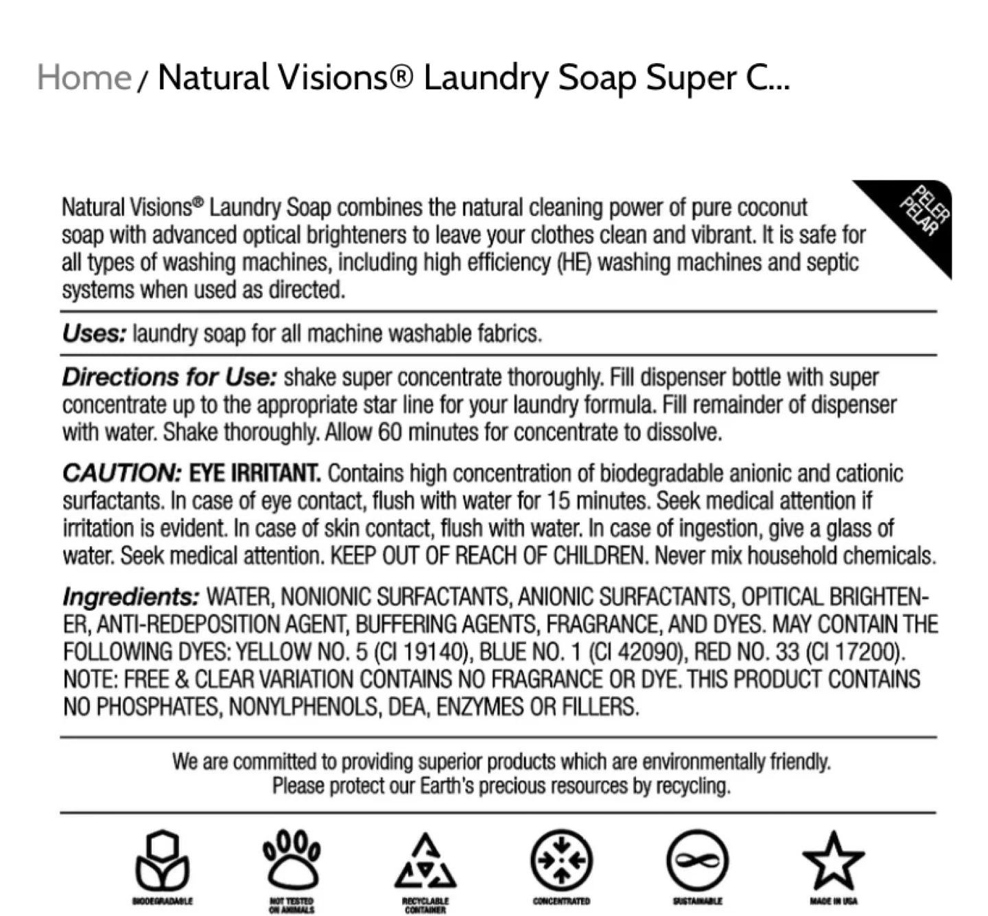 Natural Visions Laundry Soap combines the natural cleaning power of pure coconut soap with advanced optical brighteners to leave your clothes clean and vibrant. It is safe for all types of washing machines, including high efficiency (HE) washing machines and septic systems when used as directed.