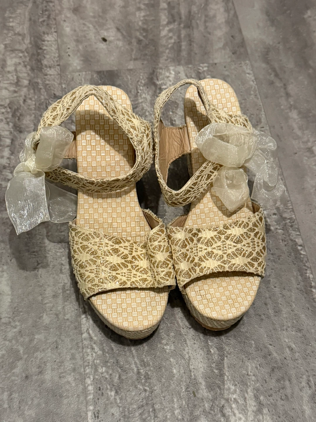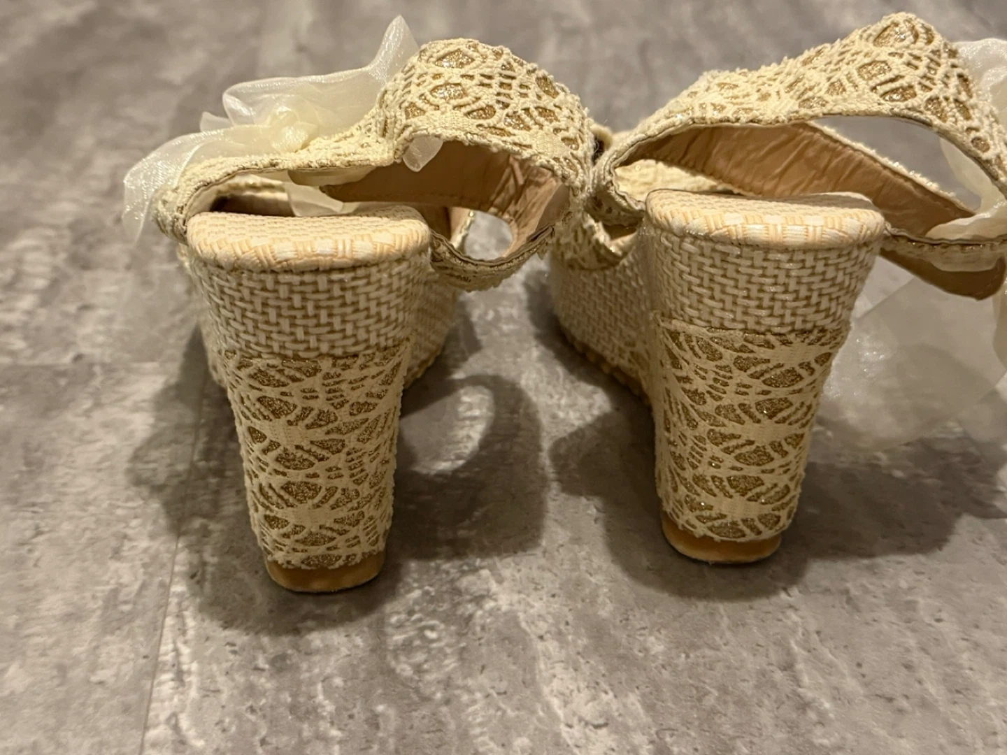 These are a pair of wedge sandals, they have a woven texture and a sweet bow detail. They're in great condition.