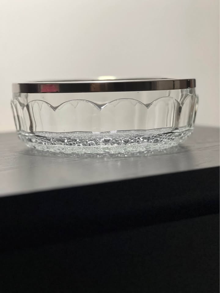 Material: The bowl itself is made of clear, heavy glass or cut lead crystal. The rim is silver-plated.