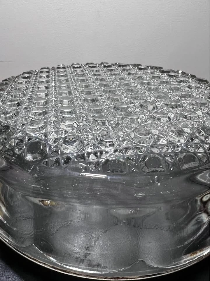 This is a vintage glass bowl with a metal rim, possibly in a "button and cane" or "hobnail" crystal pattern. English-made and dates from the mid-20th century.