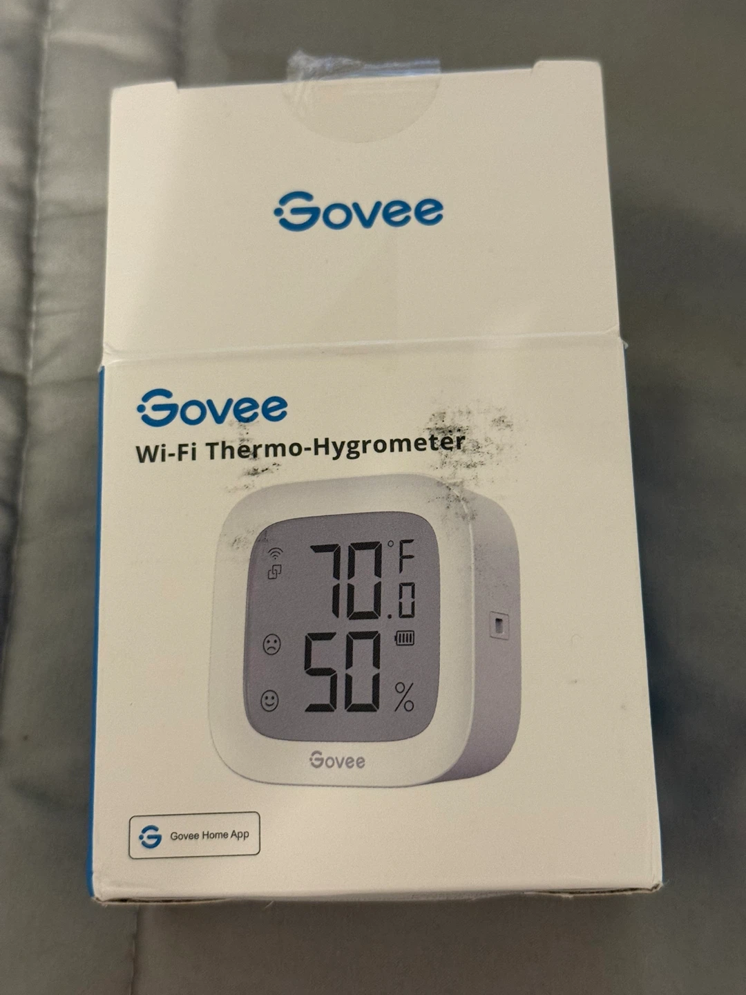Selling a Govee WiFi Thermo-Hygrometer H5103. It's an indoor Bluetooth temperature humidity sensor with an electronic ink display. Comes with the box and user manual! It has free data storage export and digital remote monitoring for the bedroom.