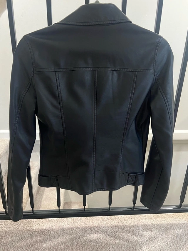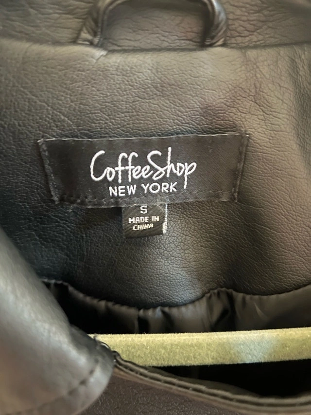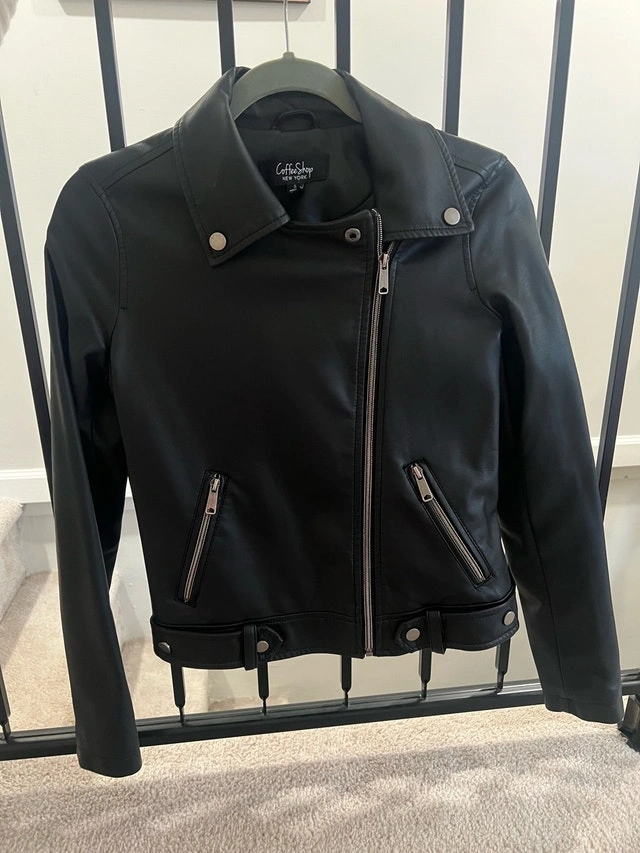 This is a Coffee Shop New York faux-leather black biker jacket, perfect for adding a touch of edgy style to any outfit. It is a size small. Never worn! Additional features include: * Asymmetrical zip closure * Silver-toned hardware * Zipped pockets