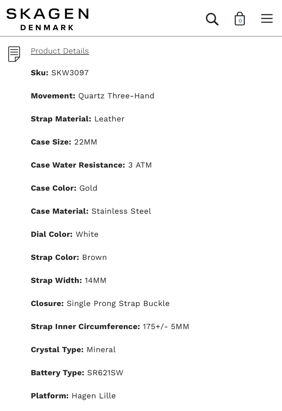 It features a brown genuine leather strap and a gold-tone stainless steel case. The dial is white and the case size is 22mm. It also comes with the original box, tags and warranty/battery information booklet.