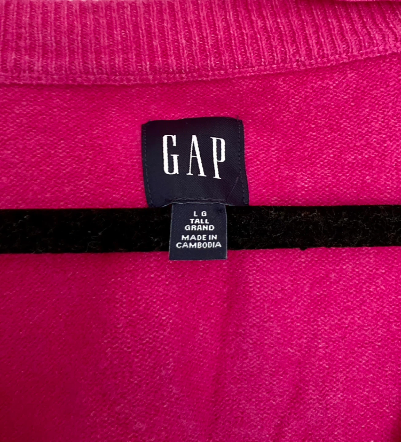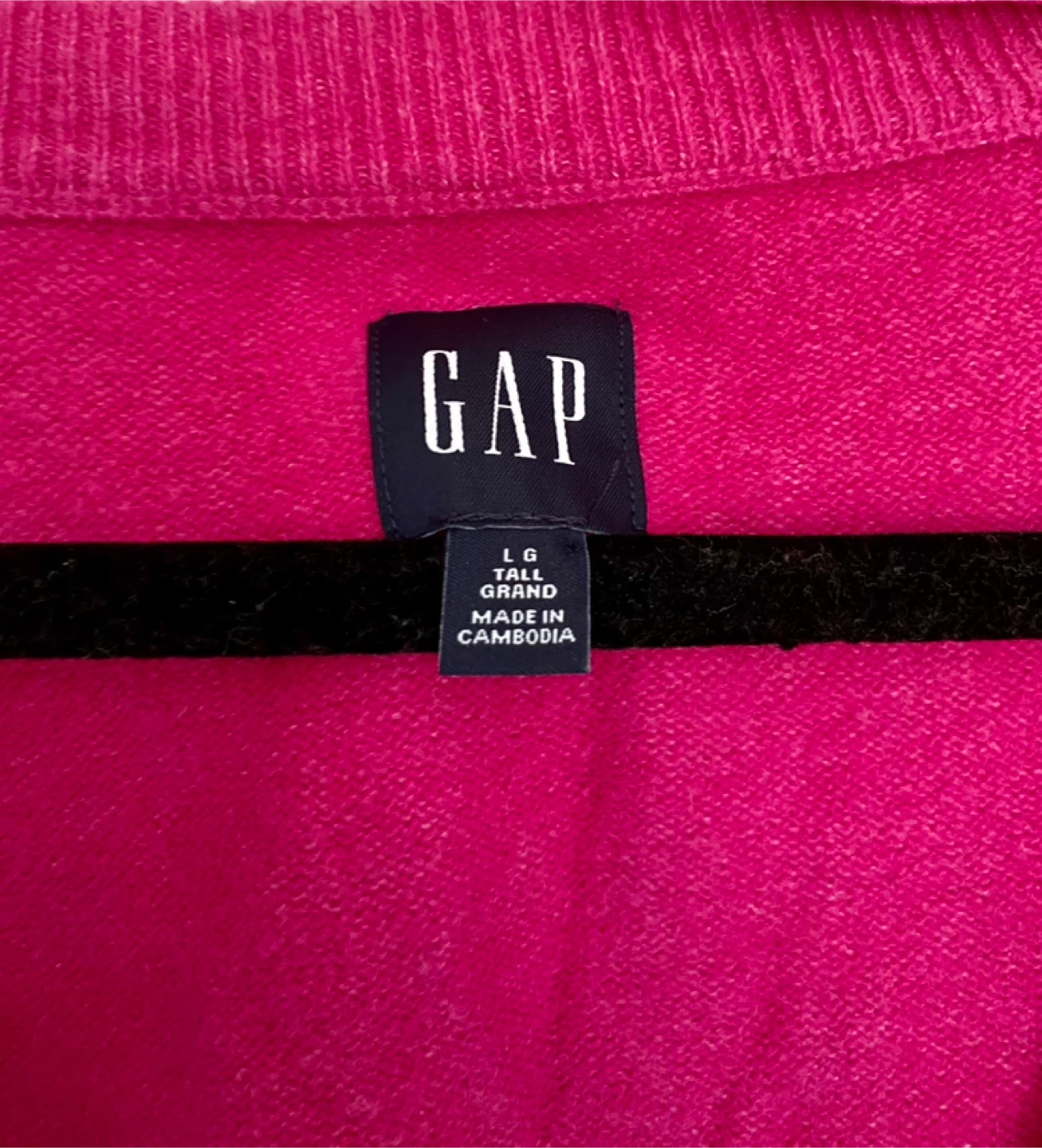 Selling a Gap V-neck sweater in a vibrant pink! It's a size L Tall. The material is a blend of 53% cotton, 24% nylon, and 23% acrylic. It's in great condition and ready for a new home!