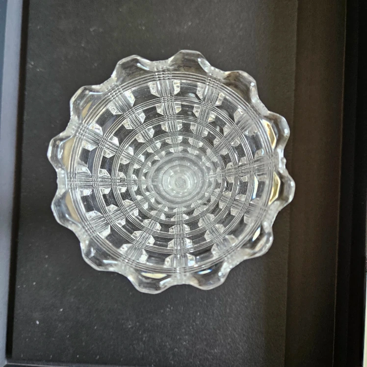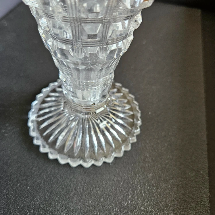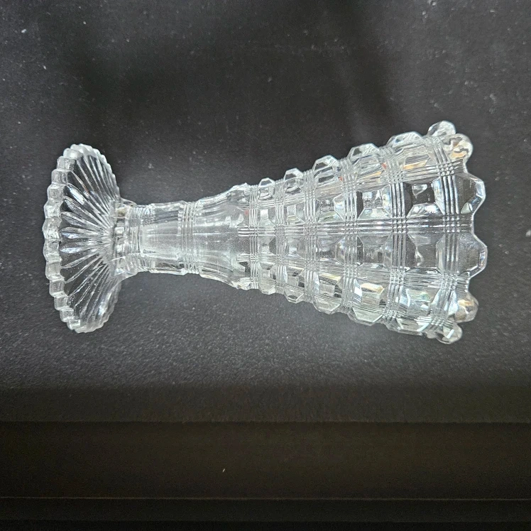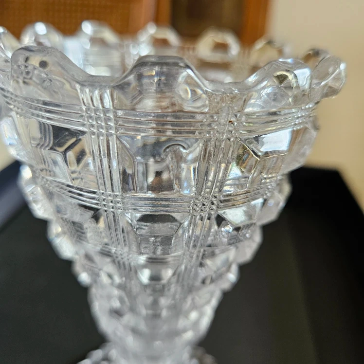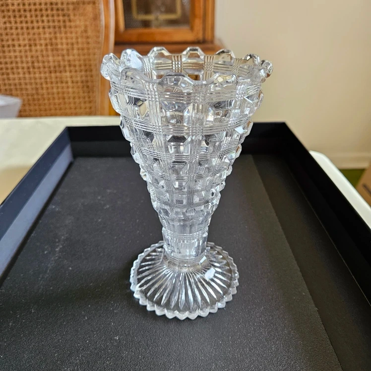 Antique Westmoreland clear glass vase. Pattern #124 Berlin Reeded Waffle. With scalloped top edge and pressed waffle pattern. Measures 9.3 cm diameter at top and 15.5 cm height. This item has some small chips in the first and second row; otherwise it is in great shape.