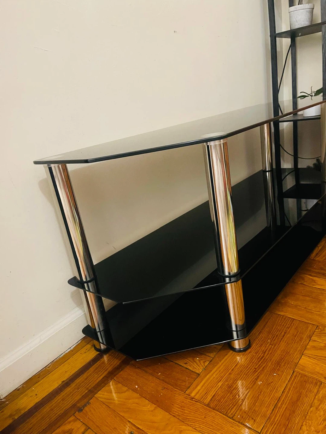 Selling a black glass TV stand with silver-colored legs. It has a sleek and modern design with two shelves for storage. Perfect for your living room or entertainment area.