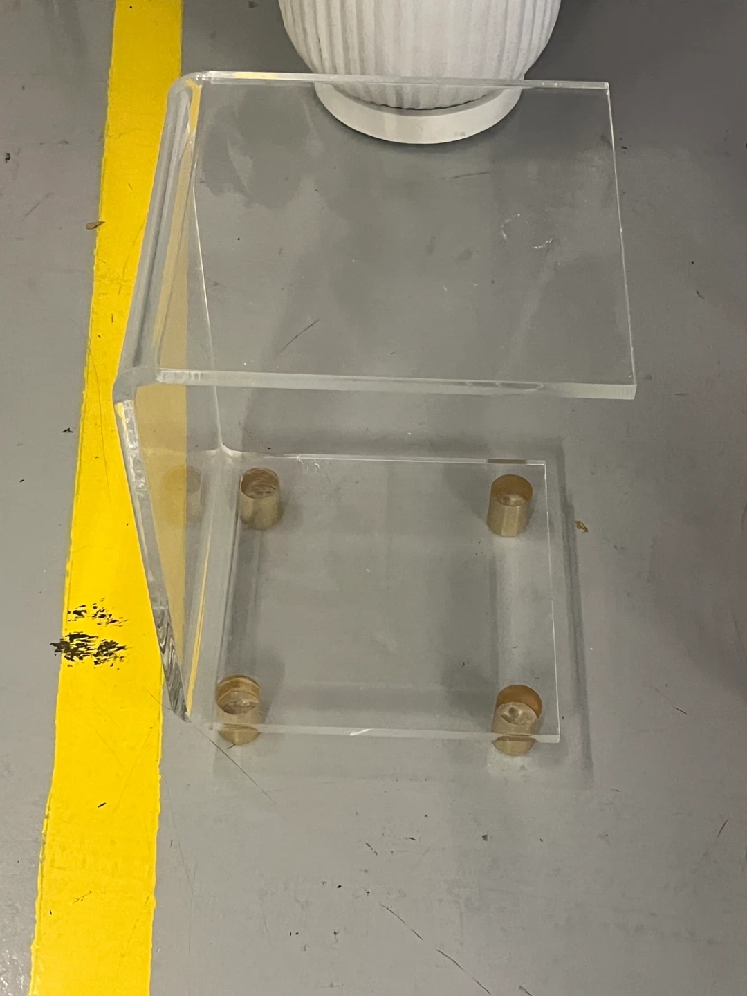 Selling a clear lucite side table!.. It features a minimalist design with a sleek, modern look… The table has a square shape and brass colored feet…