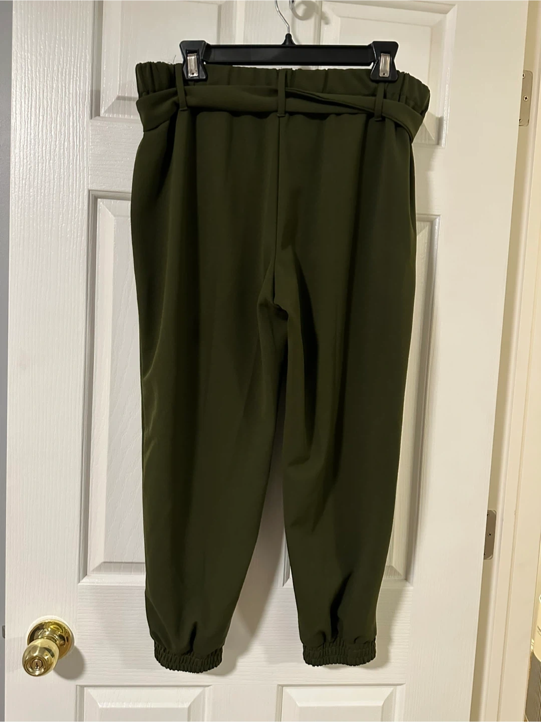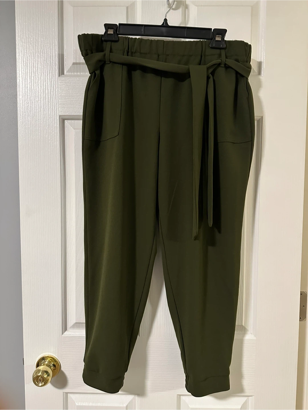 These are a pair of olive green pants from One by Chapter One! They're a size large and feature a tie belt. Perfect for a casual or dressed-up look!