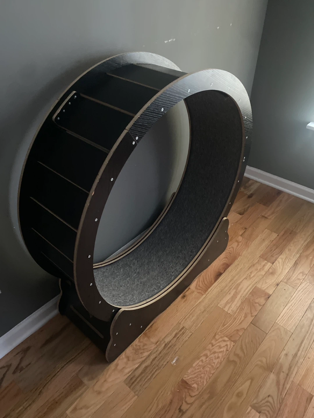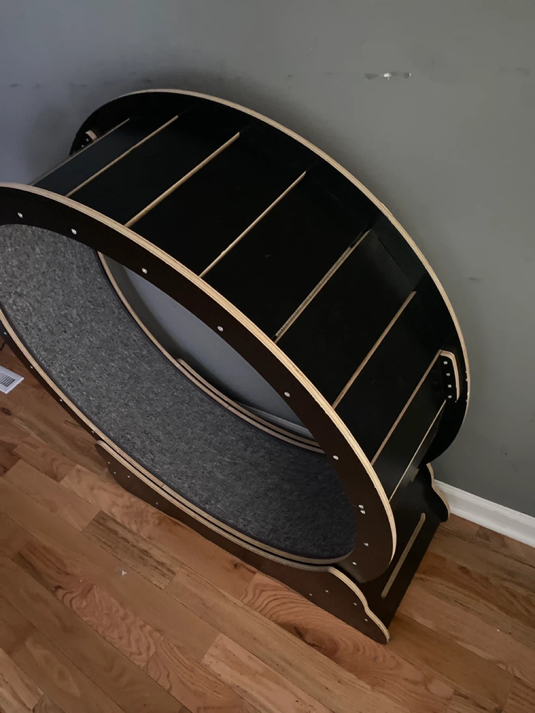 Selling a cat exercise wheel in black. It's a great way for your cat to get some exercise and have fun! It's in great condition and ready for a new home