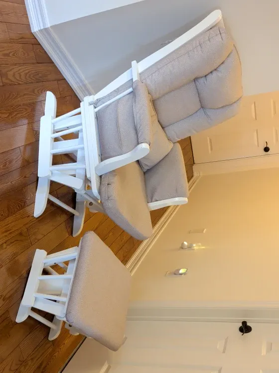 Selling a comfy glider rocking chair with a matching ottoman. It's in great shape and perfect for a nursery or living room. The cushions are a neutral beige colour, removable and washable. With the exception of the foot rest. It's super relaxing!