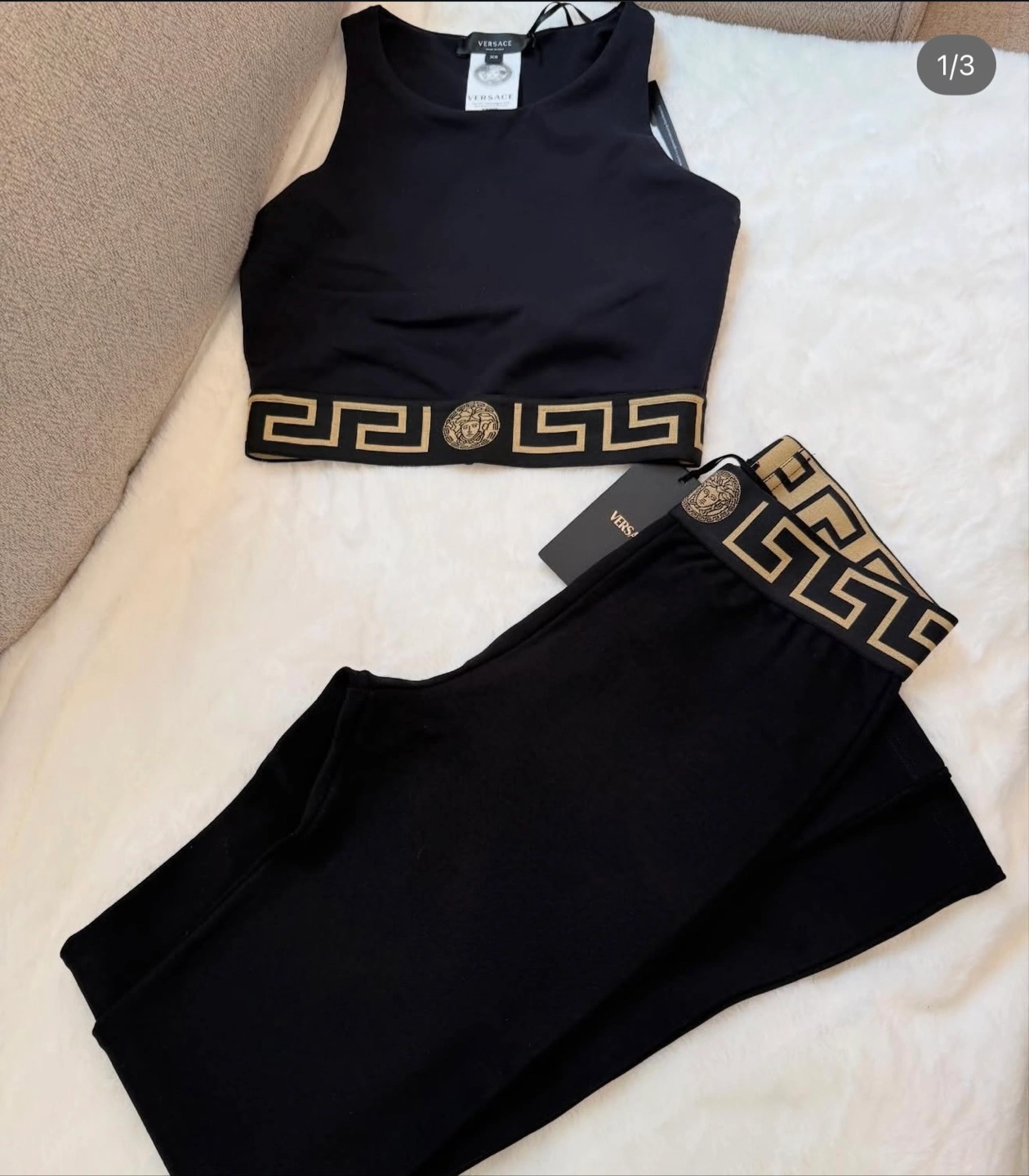 Selling a Versace activewear set in size XS! This set includes a crop top and leggings, both in black with the iconic Versace gold detailing. The material is comfortable and perfect for workouts or casual wear. Brand new with tags!