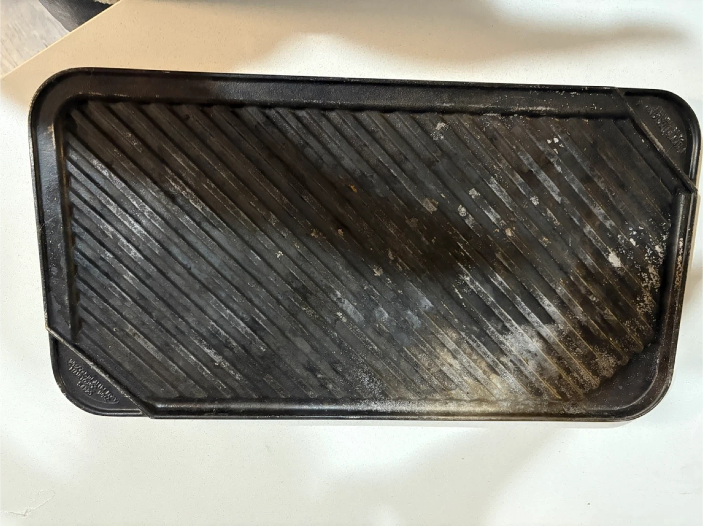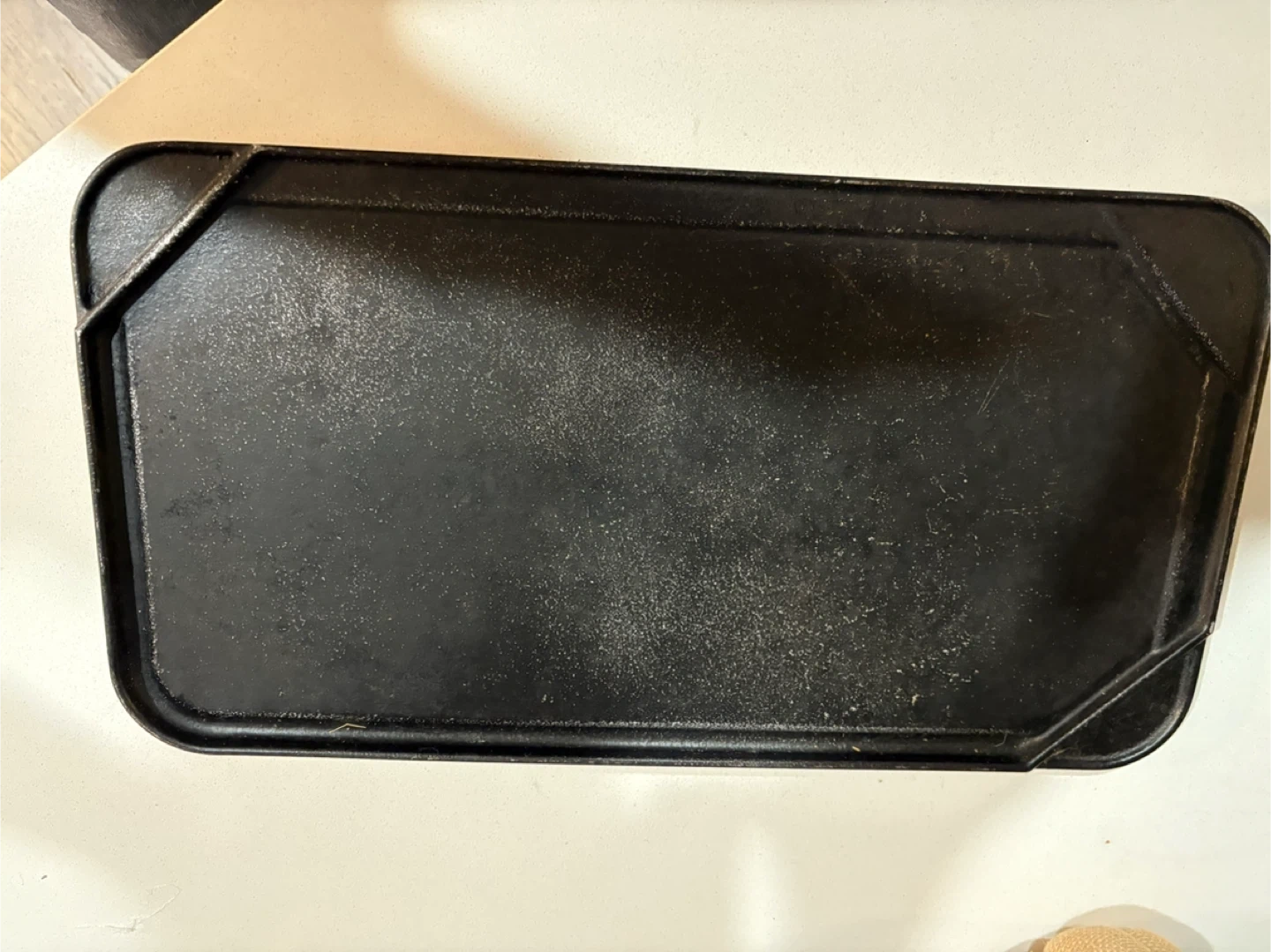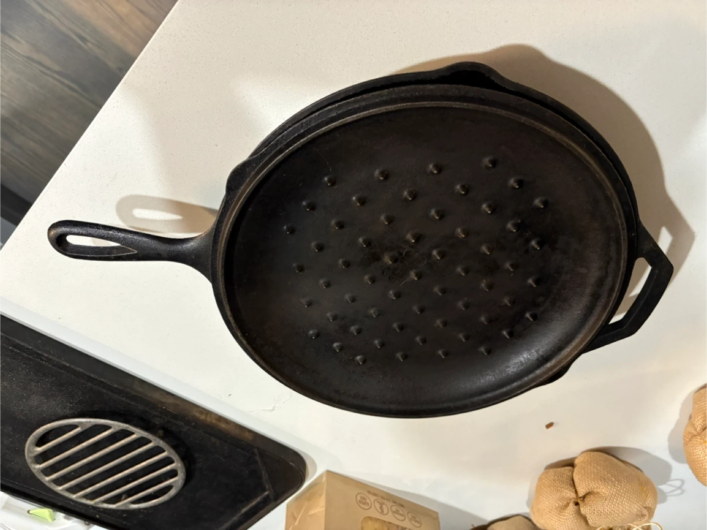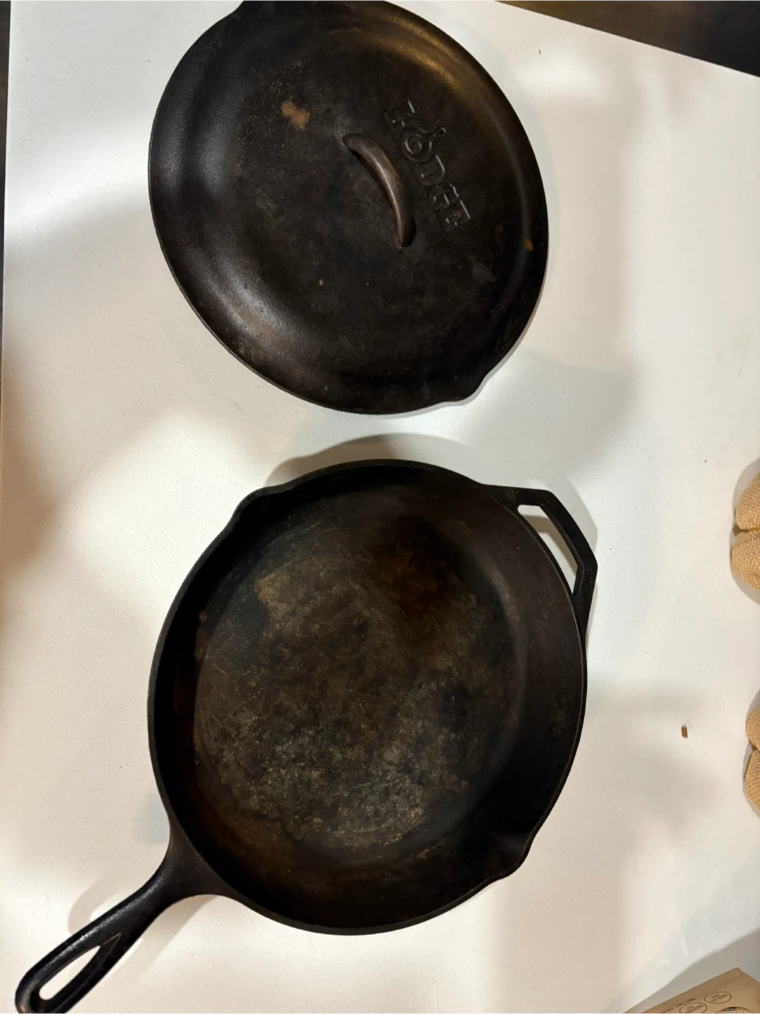 Selling a Lodge cast iron cookware set! It includes a skillet, lid, and griddle. The set shows signs of use.