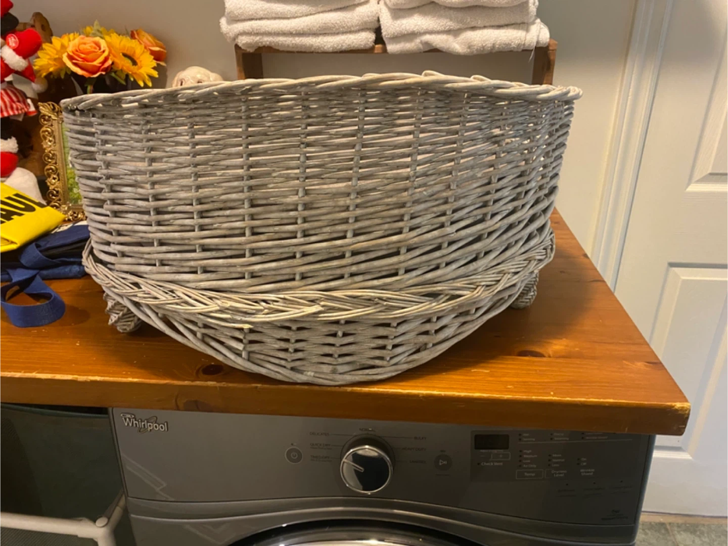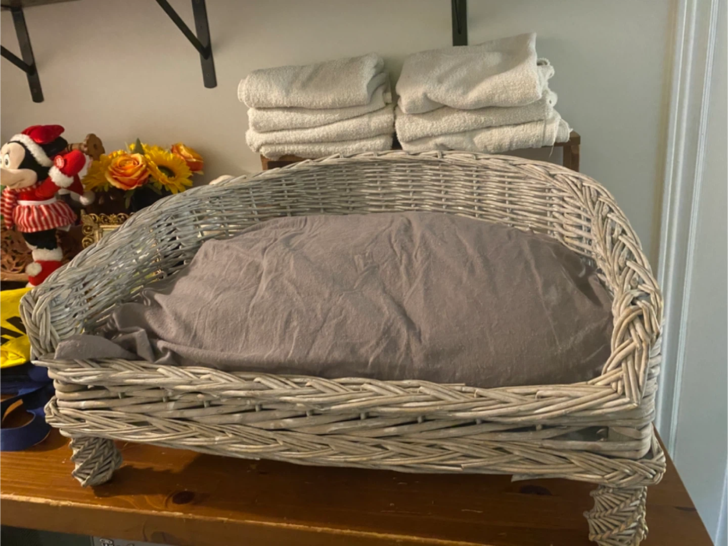 Selling a cute wicker pet bed that comes with a comfy cushion! It's perfect for small dogs or cats who like to curl up in a cozy space. The bed is in great shape and would look lovely in any room of your home