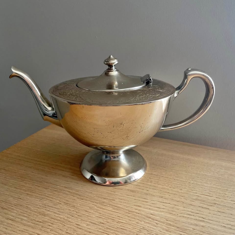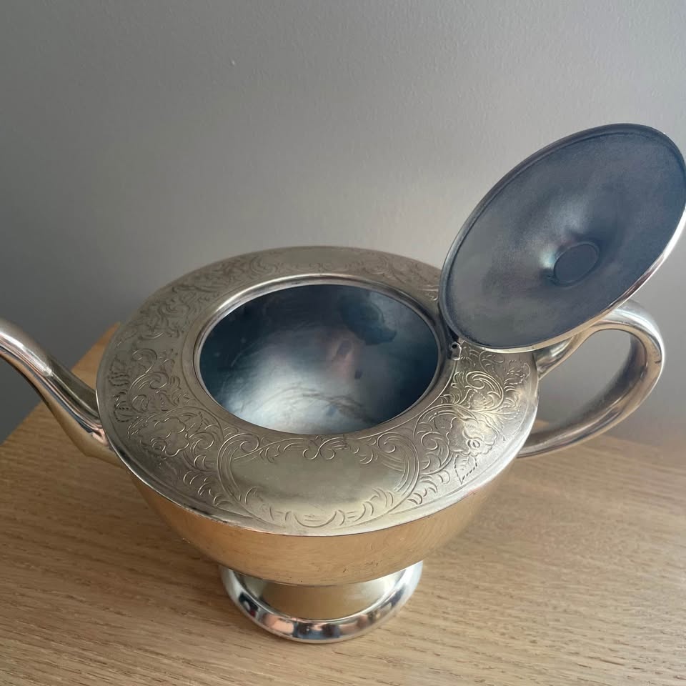 Vintage silver-plated teapot made by 1881 Rogers Canada (model 923, EPNS) with floral engraving. Approximately 9.5β wide (spout to handle).