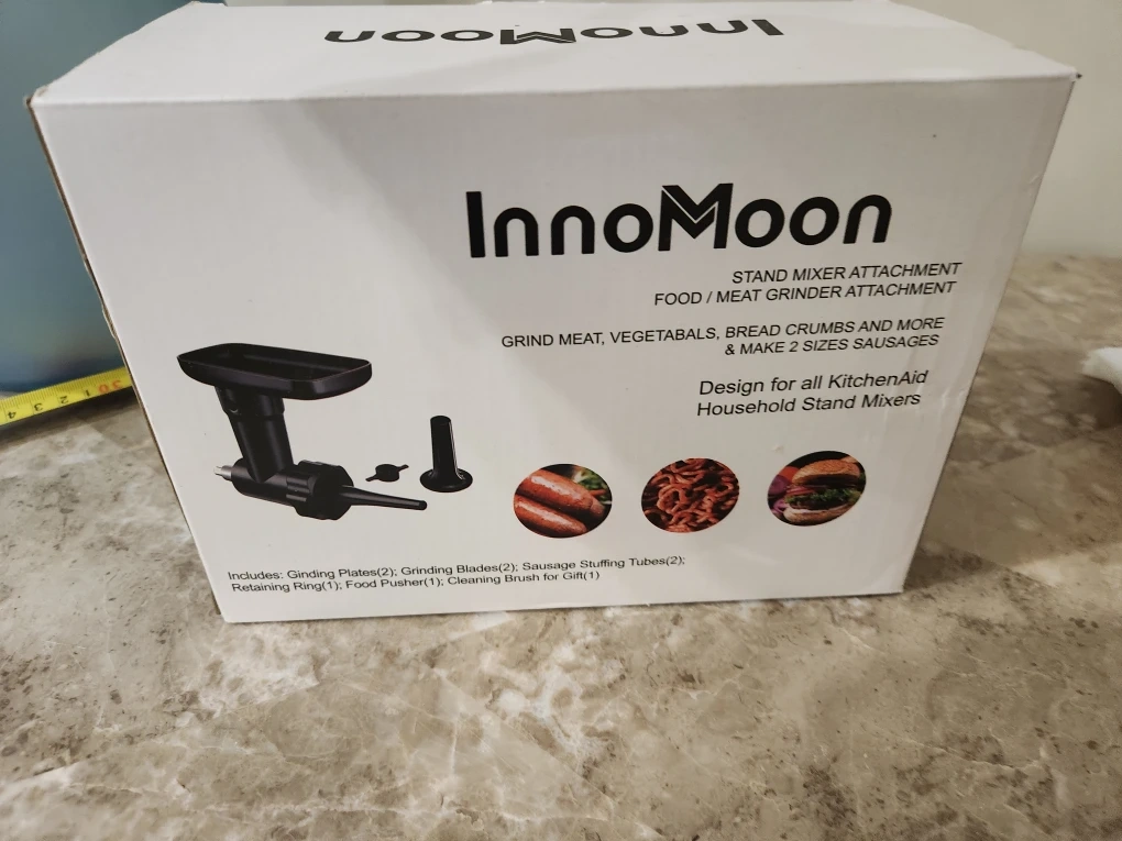 Selling an InnoMoon stand mixer attachment! It's a food and meat grinder attachment that can grind meat, vegetables, bread crumbs, and more. It also makes 2 sizes of sausages. It's designed for all KitchenAid household stand mixers. Included are grinding plates, grinding blades, sausage stuffing tubes, retaining ring, food pusher, and a cleaning brush. $60
