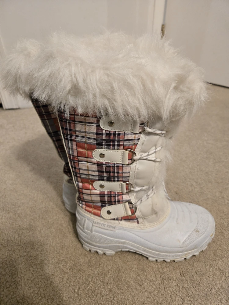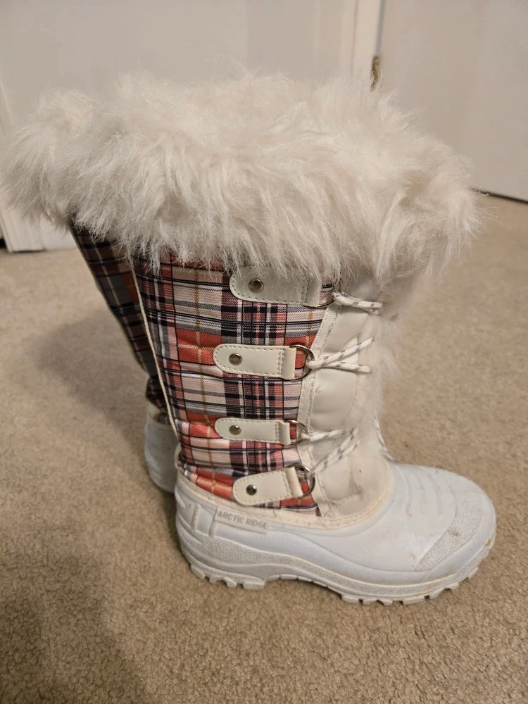 Cozy up this winter with these Arctic Ridge snow boots! They feature a plaid pattern with white accents and a fluffy white trim. Perfect for keeping your feet warm and stylish during those snowy days. Still in VGC, pickup in Beach Grove.