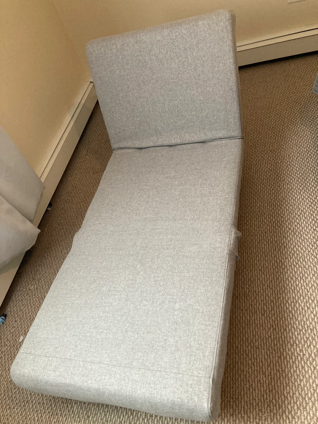 Selling a comfortable gray lounge chair. It's in good condition and perfect for relaxing. The material is soft and cozy. This chair would be a great addition to any living room or bedroom and it becomes a bed.