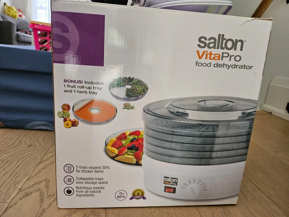 Selling a Salton VitaPro food dehydrator. It comes with 5 trays that expand 30% for thicker items, and collapsible trays to save storage space. The box includes a fruit roll-up tray and a herb tray, so you can make nutritious snacks from all natural ingredients. It's also BPA free!