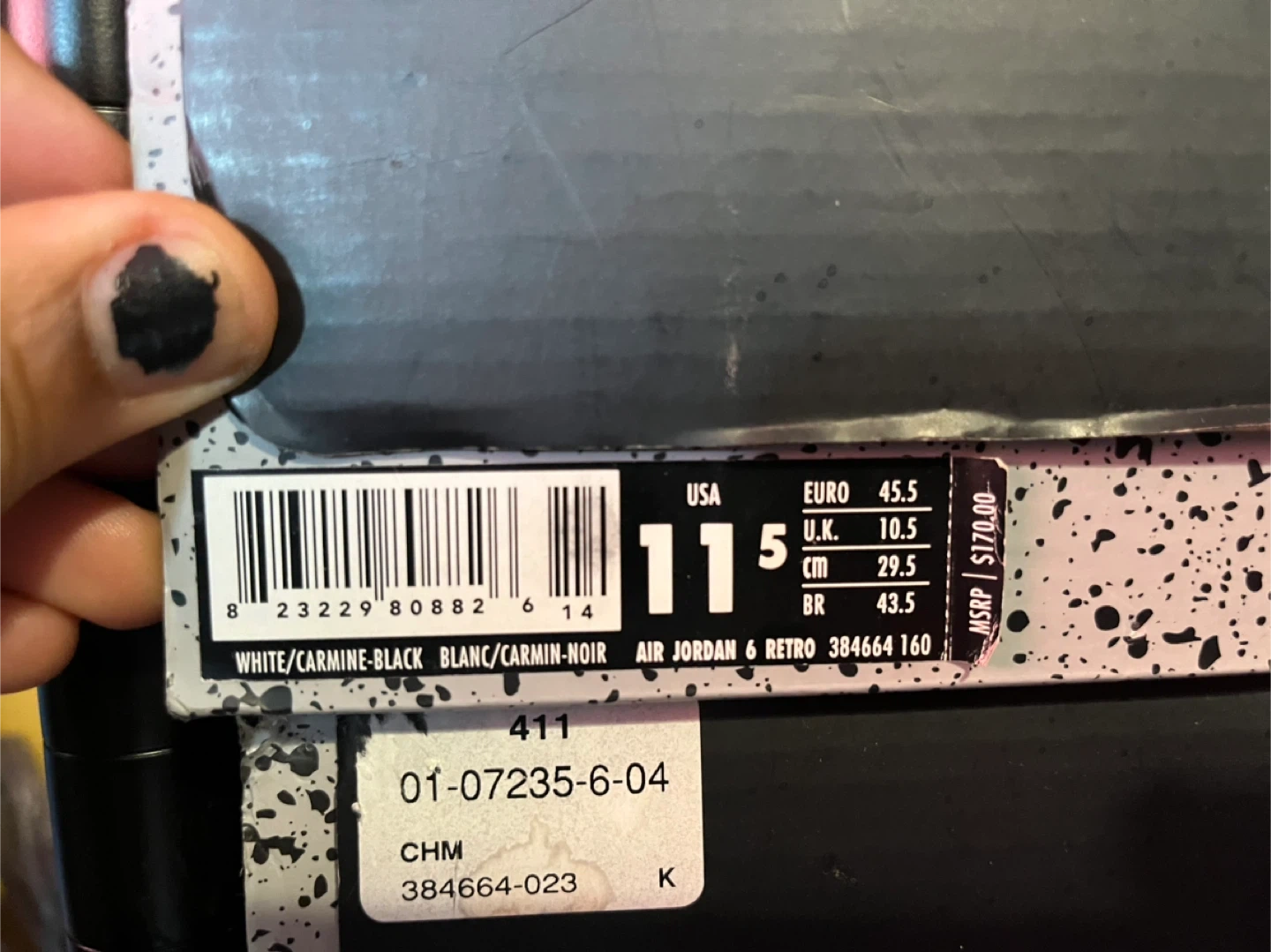 Selling a pair of Air Jordan 6 Retro in the Carmine colorway. They are size 11.5 in US sizing. The original box is included. The MSRP on the box shows $170.00.