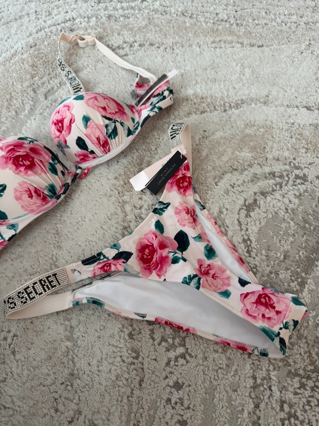 Victoria's Secret swimsuit set featuring a floral pattern. The bra size is 34B, bottom is a medium. The set includes both the top and bottom. Perfect for your next beach day!
