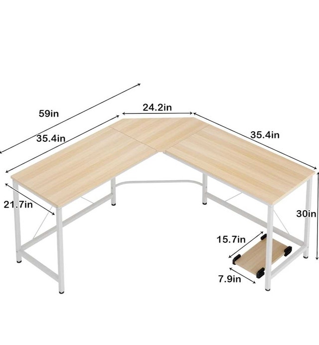 This is an L-shaped table, perfect for a home office setup, complete with a PC stand! As you can see, it's in used condition. It's ready to help you conquer your daily tasks or dive into your favourite games.