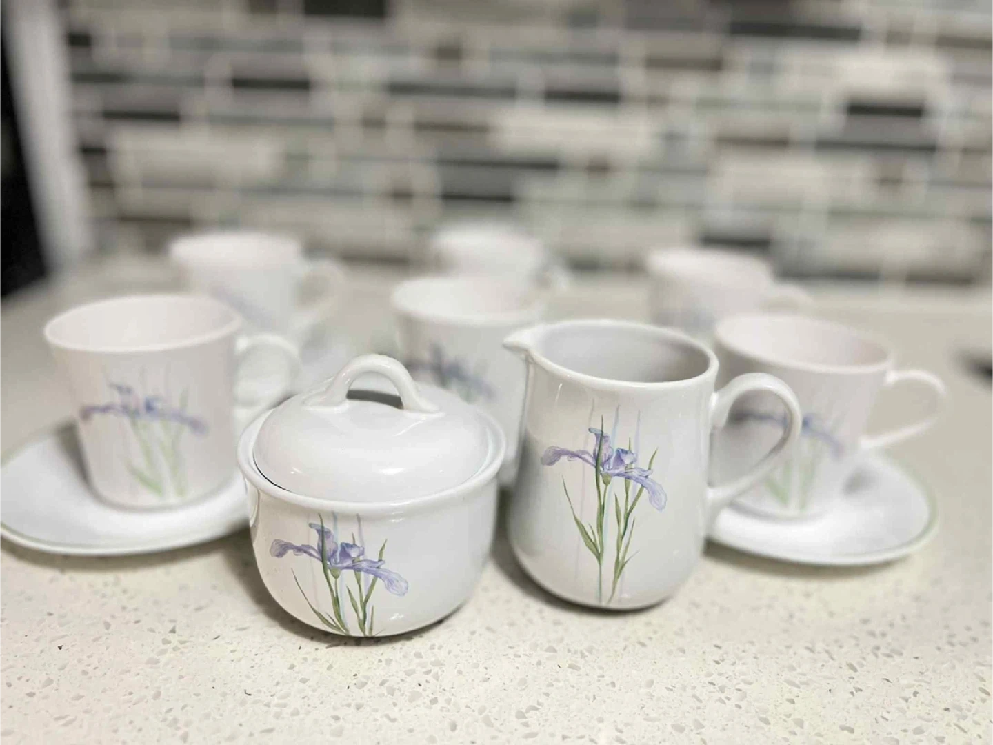 Selling a Corelle Iris 16-piece dinnerware set! It includes mugs, plates, saucers, a sugar bowl, and a creamer, all in a lovely white colour with a delicate iris flower design. Perfect for adding a touch of elegance to your dining table!
