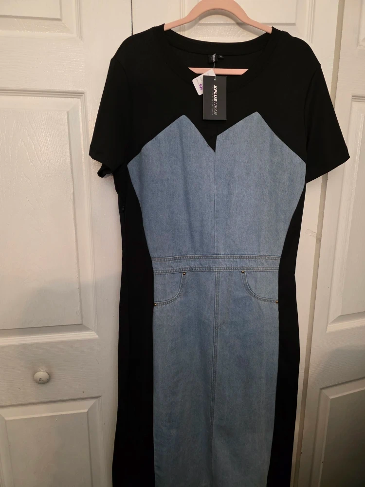 I'm selling a cute XPLUSWEAR dress that features a unique denim panel design. The dress is black with a denim center panel. It's in great condition and ready for a new home!