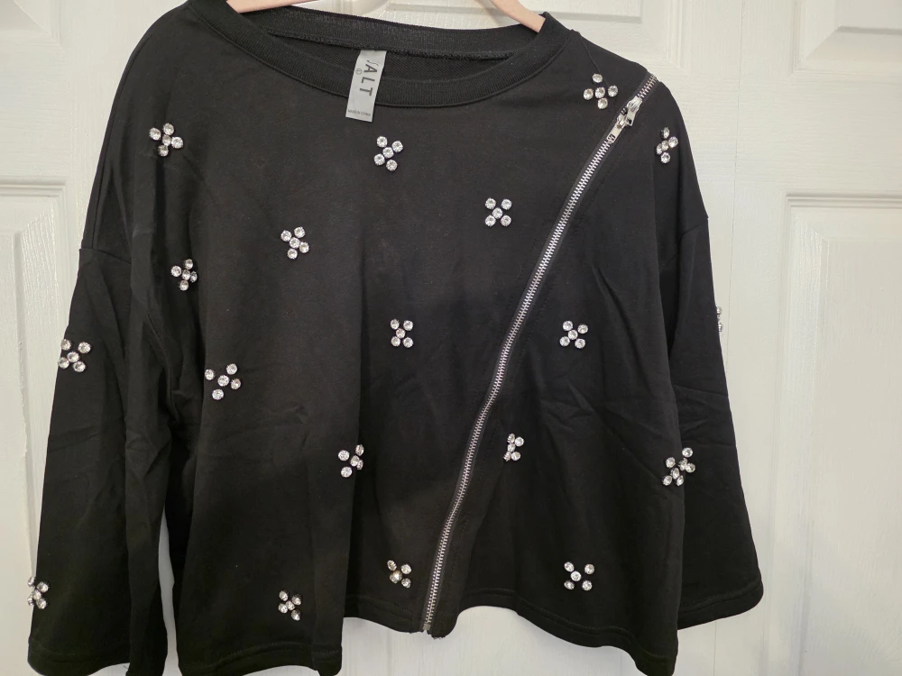 Here's a black sweatshirt from ALT! It features a unique diagonal zipper design and is embellished with sparkly accents. It's in great condition and ready for a new home