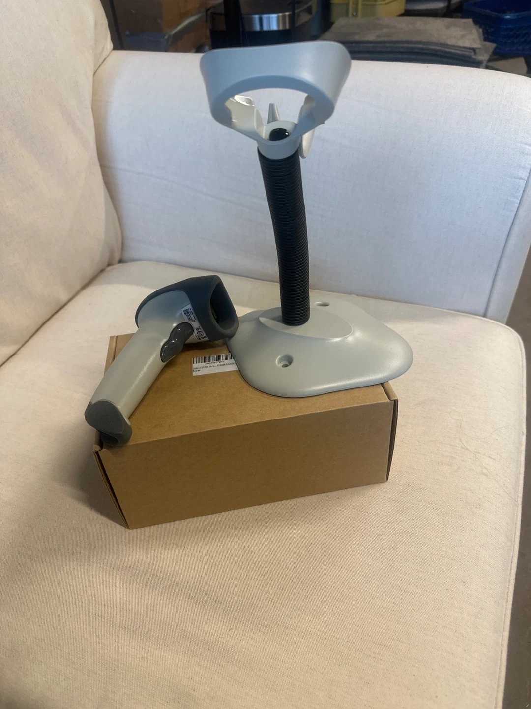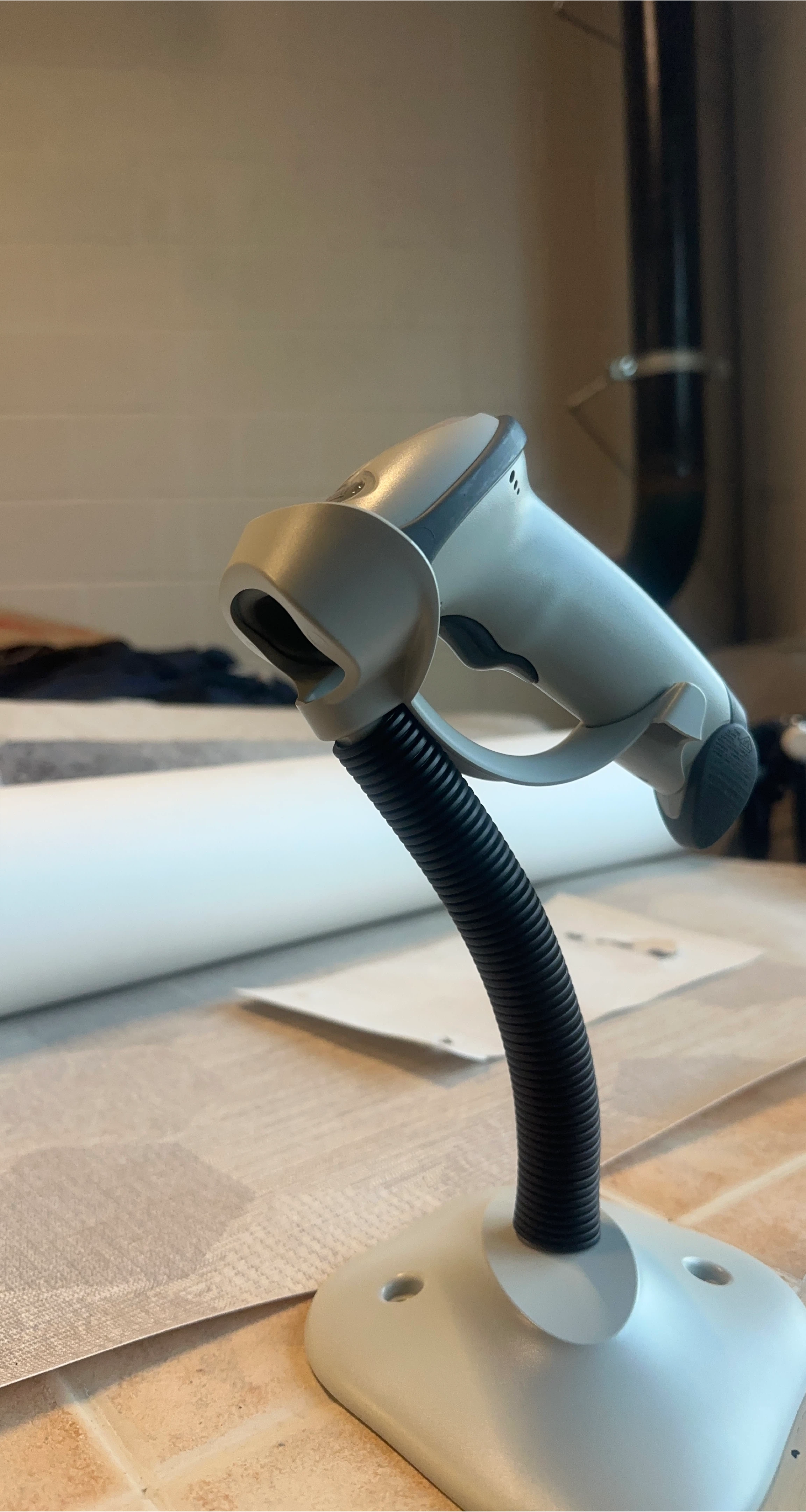 I have a barcode scanner with a stand available. It's in good condition and ready for use. Perfect for small businesses or anyone needing to scan barcodes efficiently