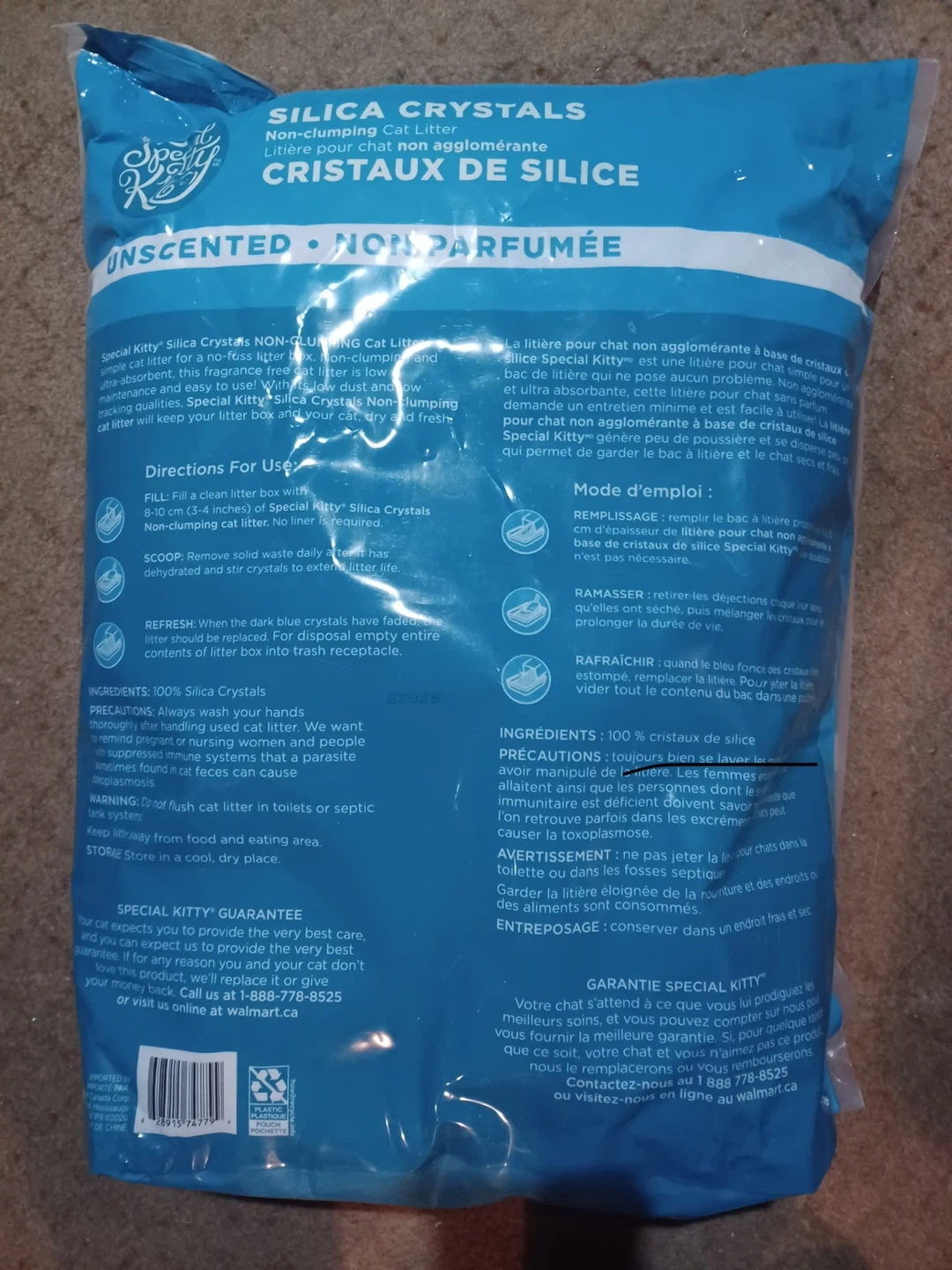 Selling 6 bags of Special Kitty Silica Crystals Non-Clumping Cat Litter. It's unscented and helps control odours without any added perfumes. This litter also features reduced tracking and indicator crystals to make cleaning easier for you and your feline friend