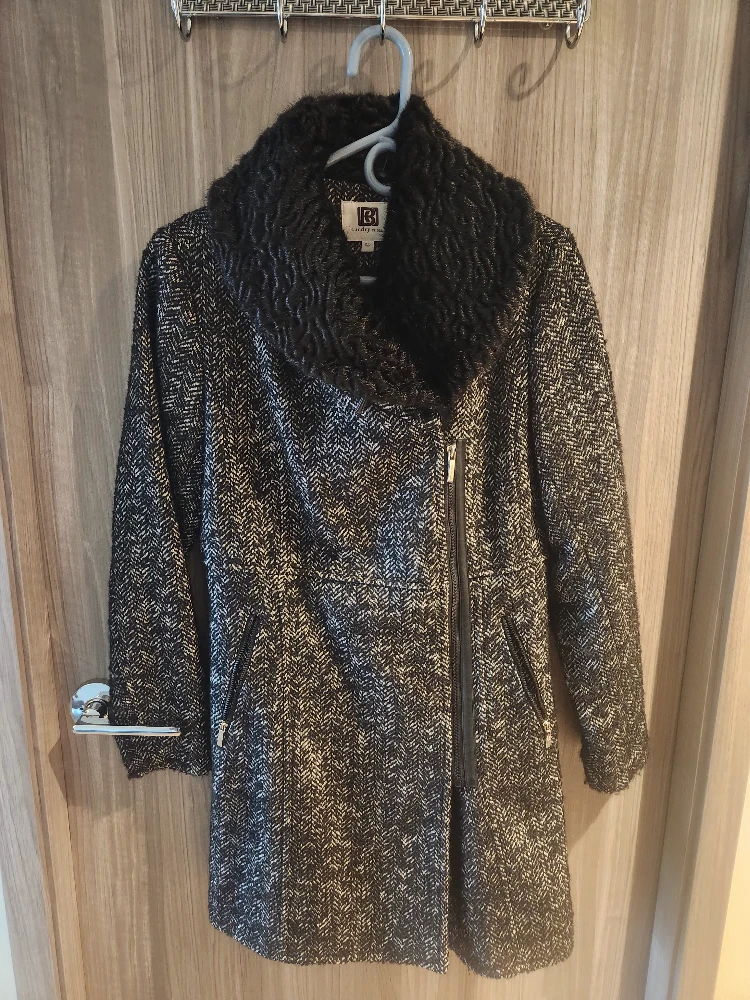 Laundry by Design coat in size S/P. It features a stylish herringbone pattern and a faux fur collar. Great for adding a touch of elegance to your wardrobe!
