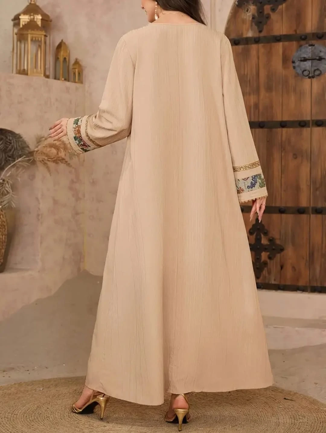 This is a beautiful beige dress with embroidery detailing on the sleeves and neckline. It's a long-sleeved dress that would be a great addition to any wardrobe!
